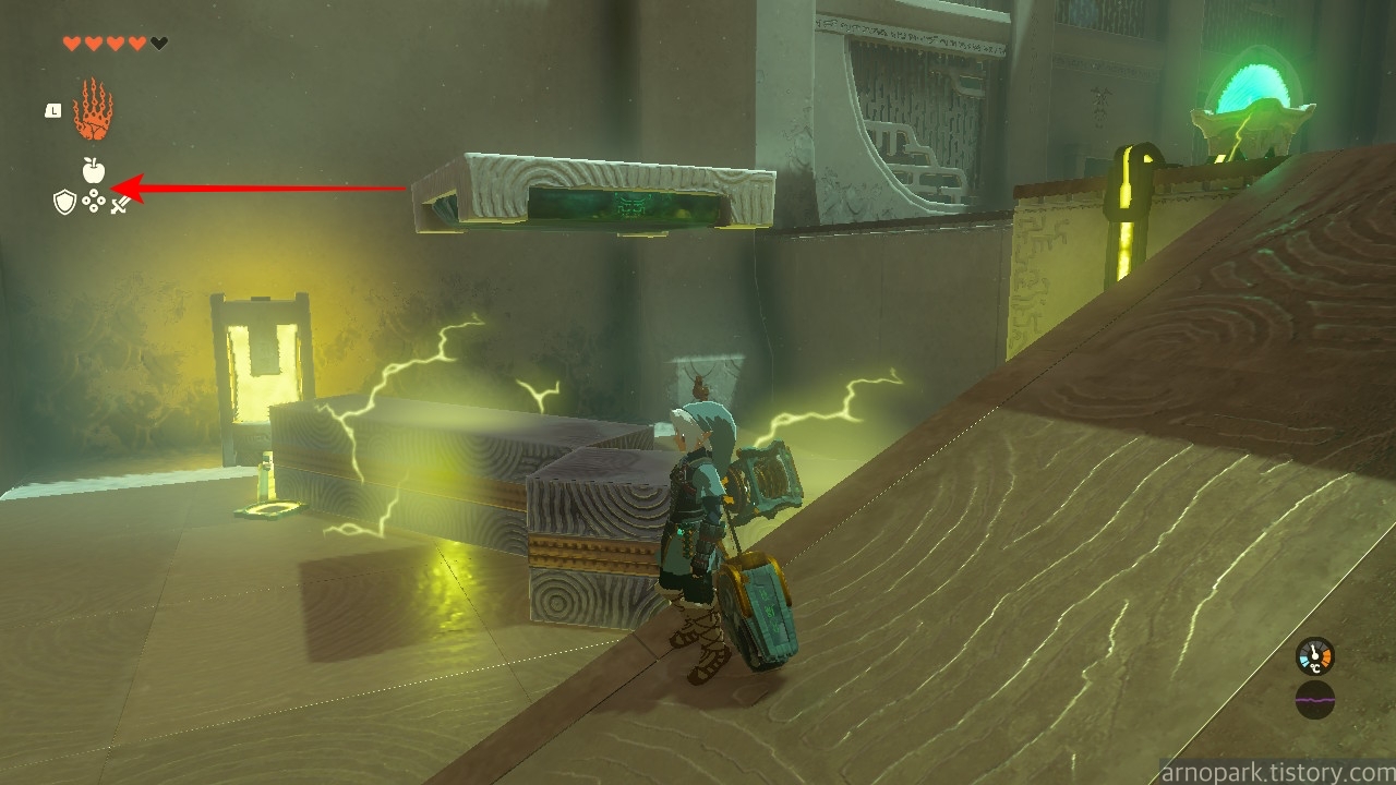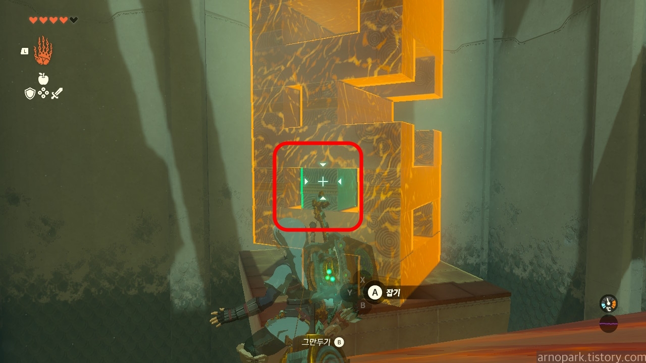 막대 블럭 2개를 사진처럼 교차로 놓습니다. 그러면 링크가 블럭을 타고 올라갑니다.