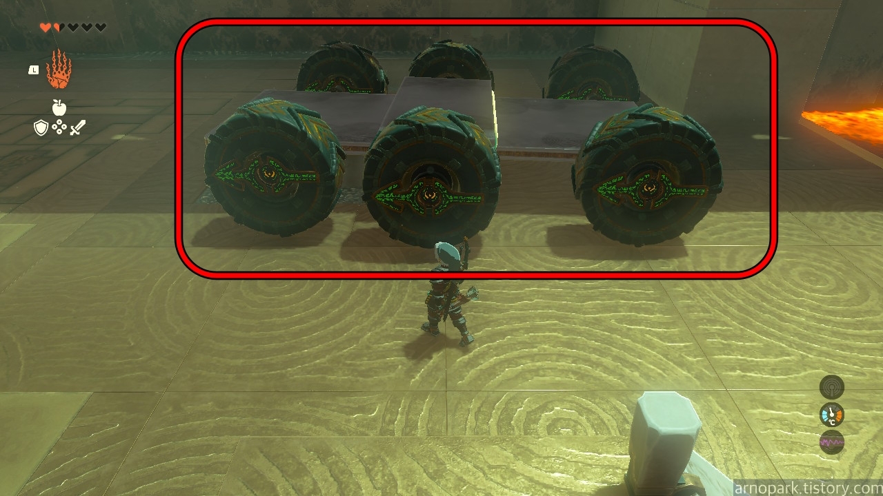 두 번째 구역에 있는 두 개의 자동차와, 아까 첫 번째 구역에서 용암을 건너기 위해 사용한 자동차를 가져옵니다.
