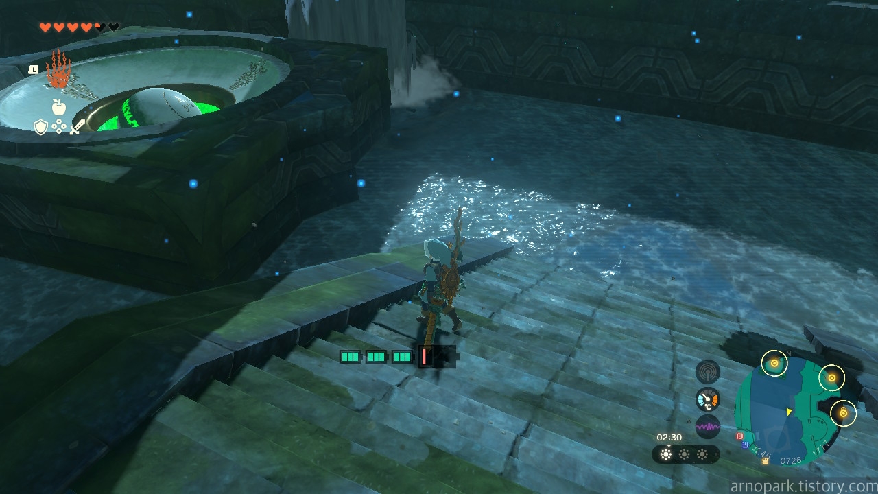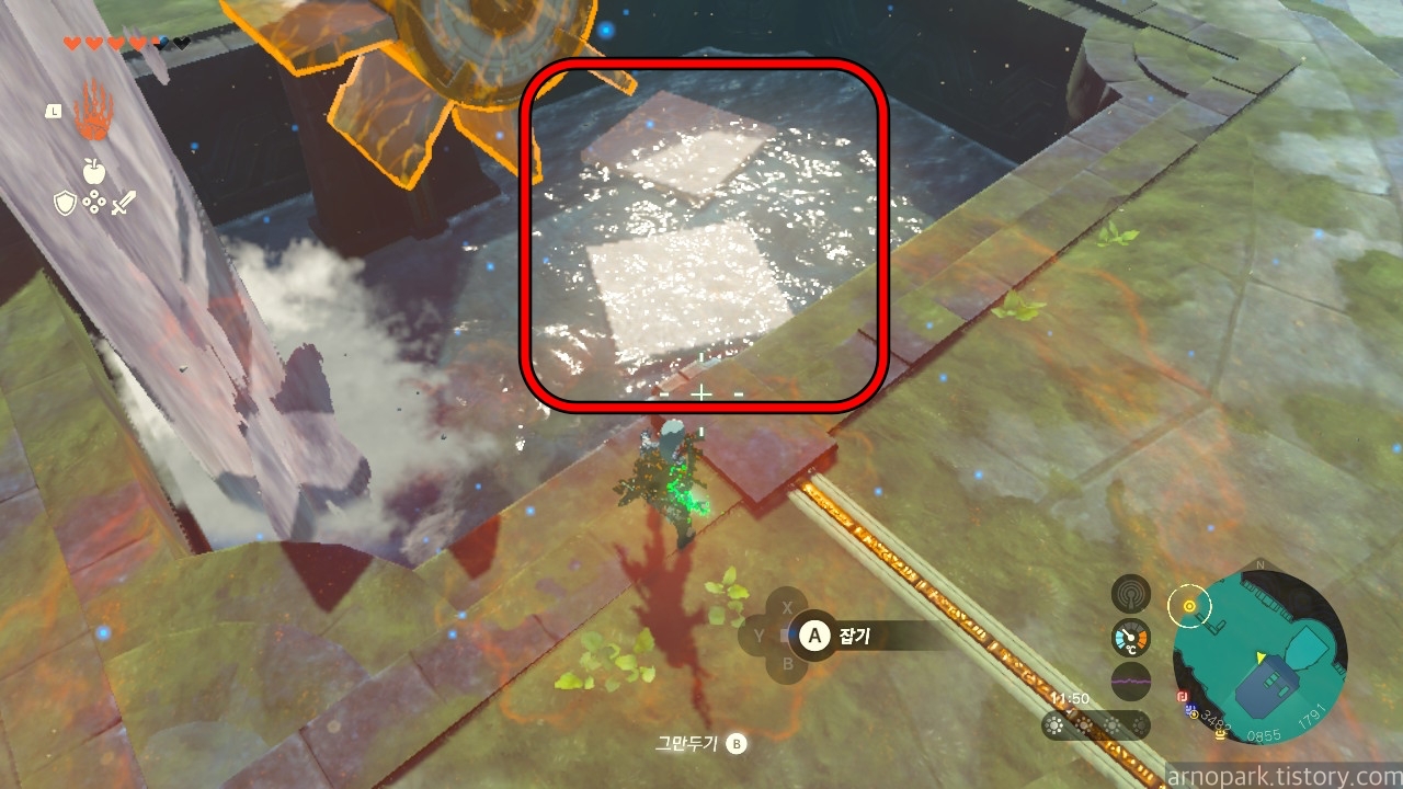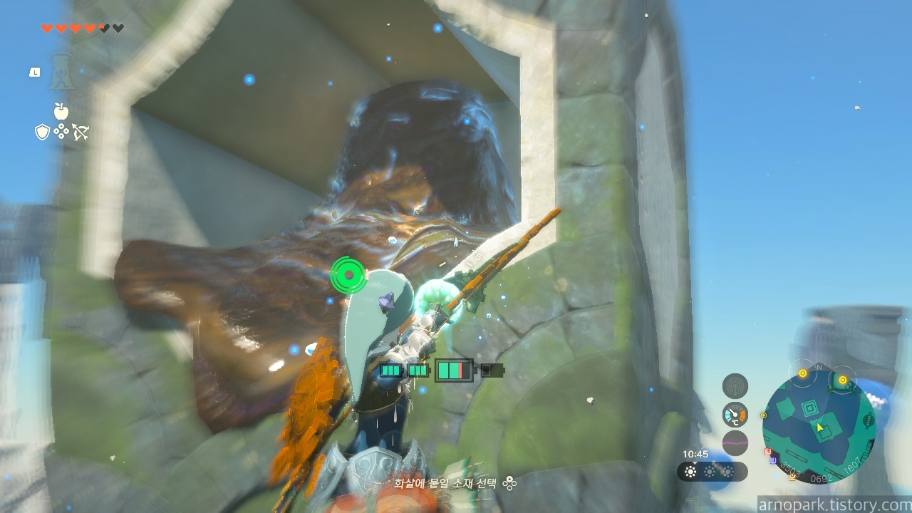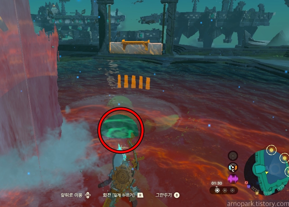 점프를 한 후, 물 열매를 장착한 화살을 진흙에 발사합니다.