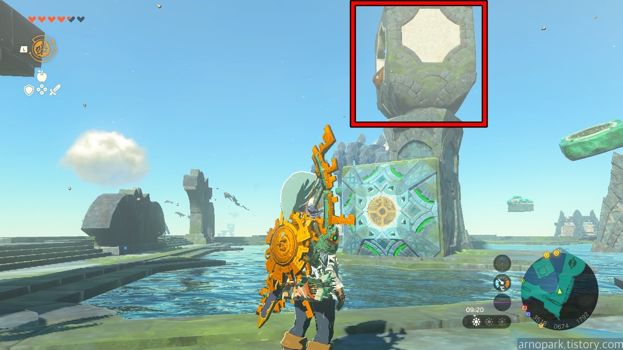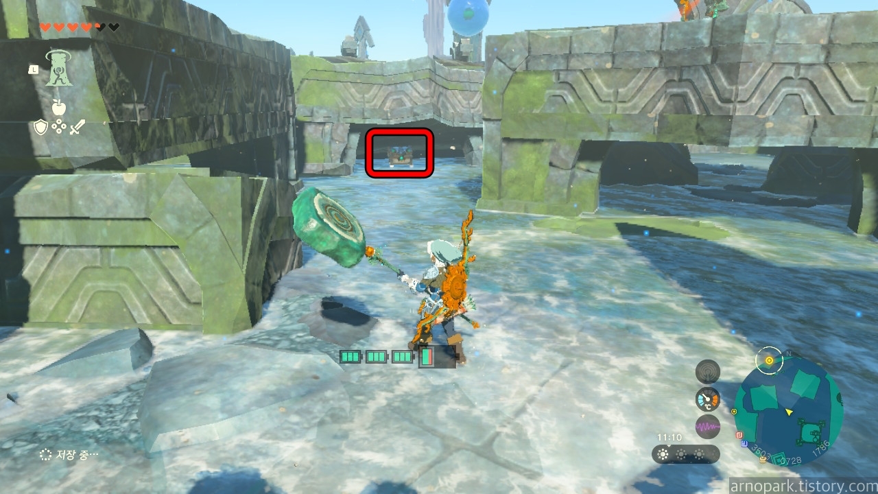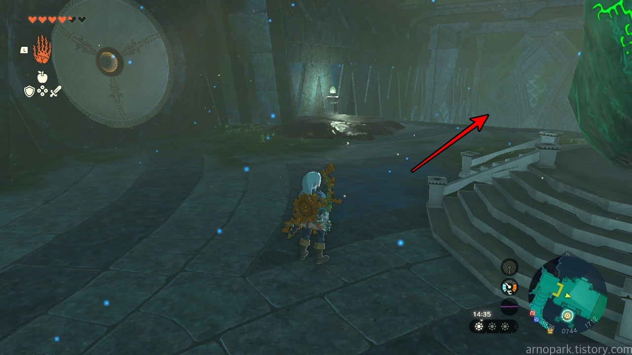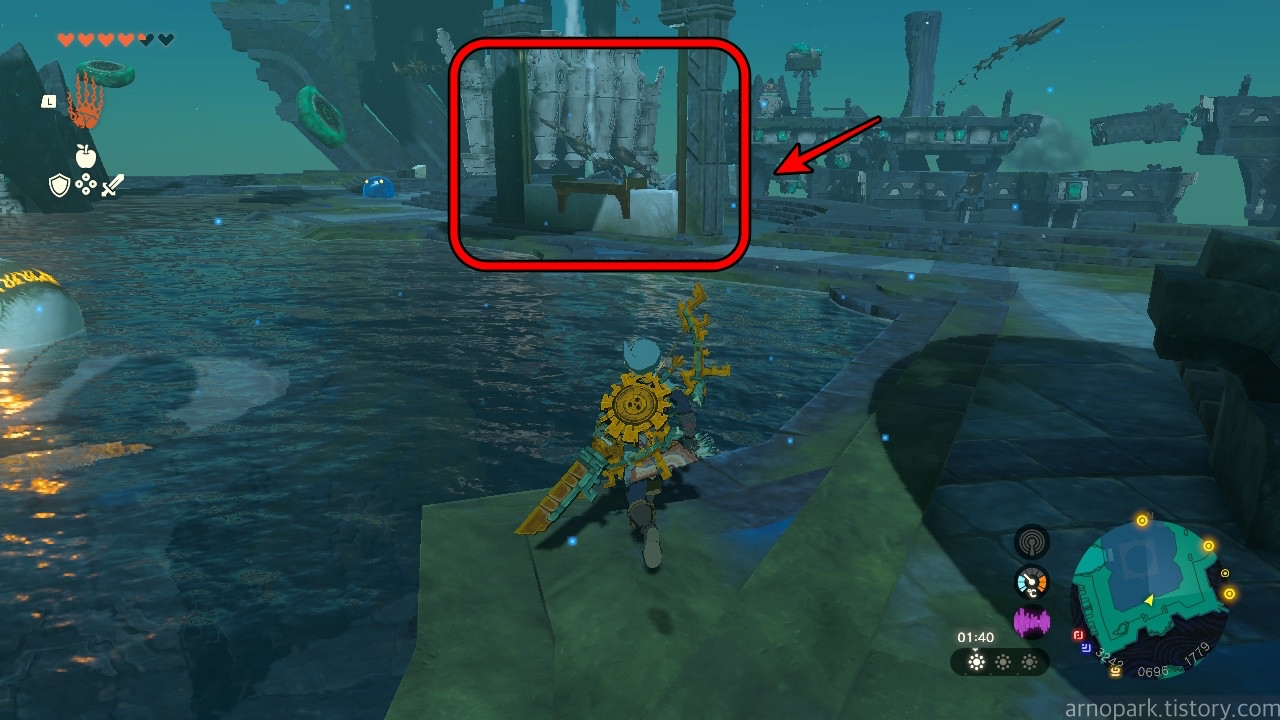 점프를 한 후, 물 열매를 장착한 화살을 진흙에 발사합니다.