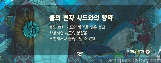 메인 챌린지 - 조라의 마을의 시드가 클리어되고, '물의 현자 시드와의 맹약' 아이템을 얻습니다.