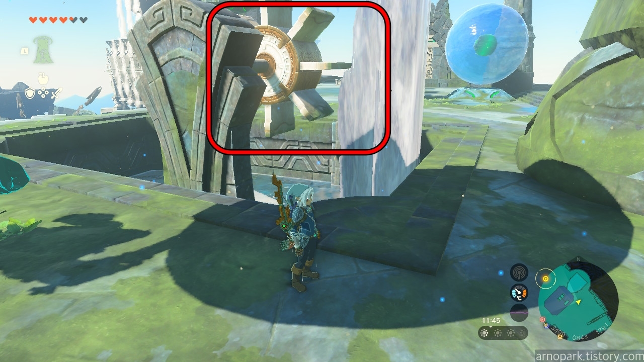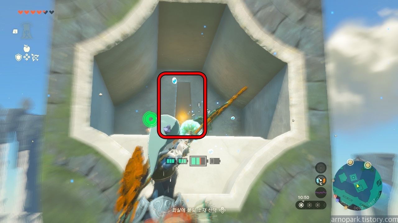 그러면 진흙이 벗겨지고 스위치가 나타납니다. 스위치를 다시 화살로 때립니다.