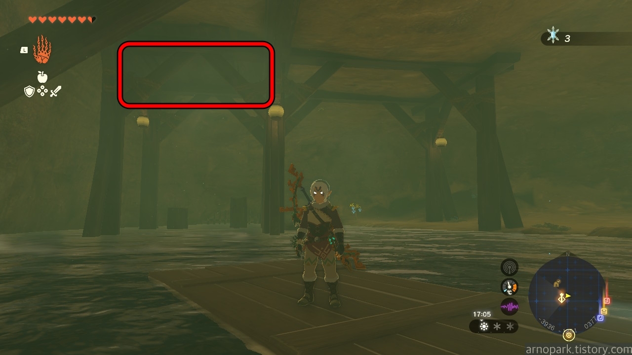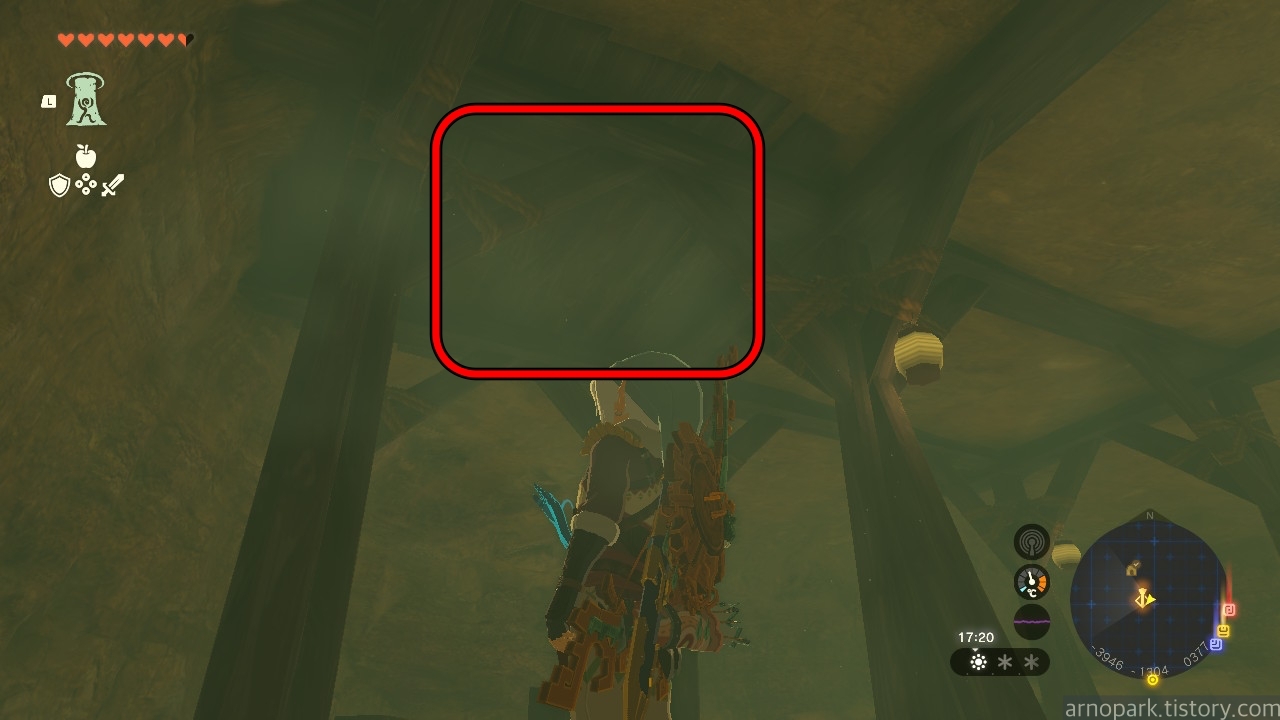 나무 천장으로 트레루프를 타고 올라가면 됩니다.
