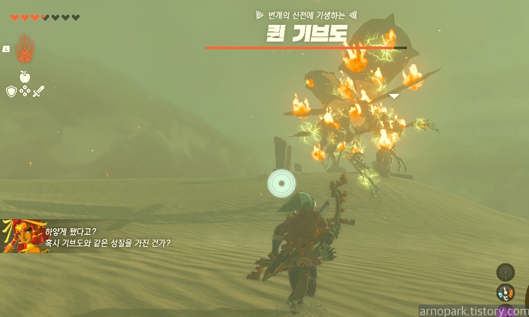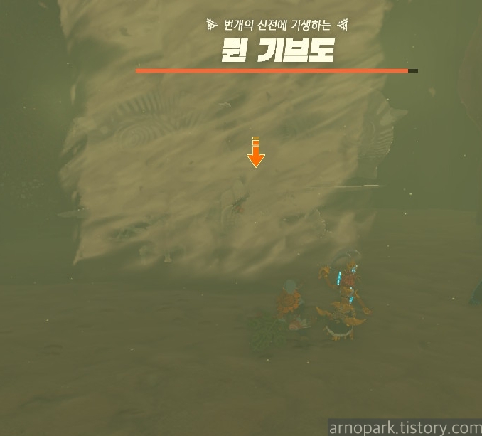 퀸 기브도는 모래 레이저를 발사합니다. 방패로 막거나 달리면서 피합시다.