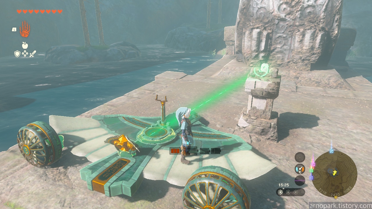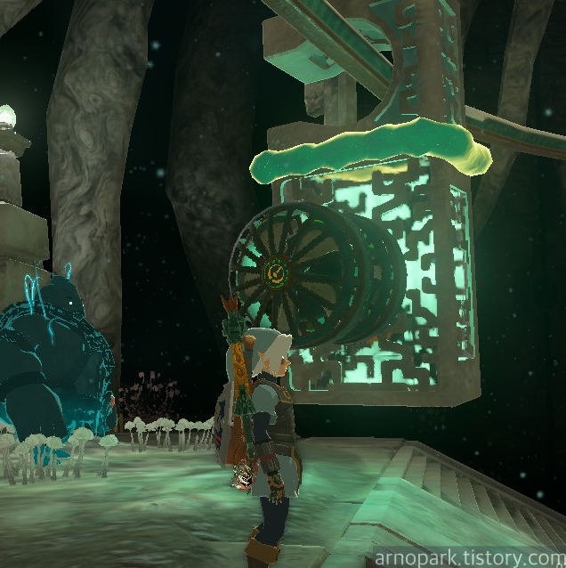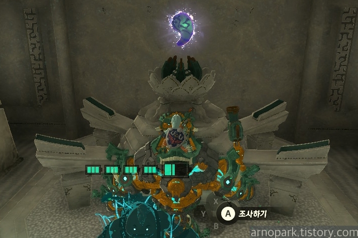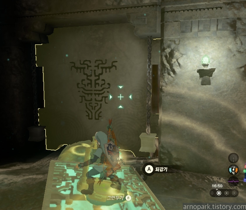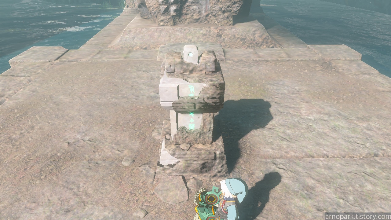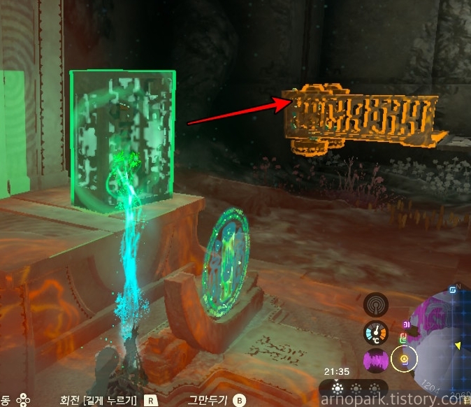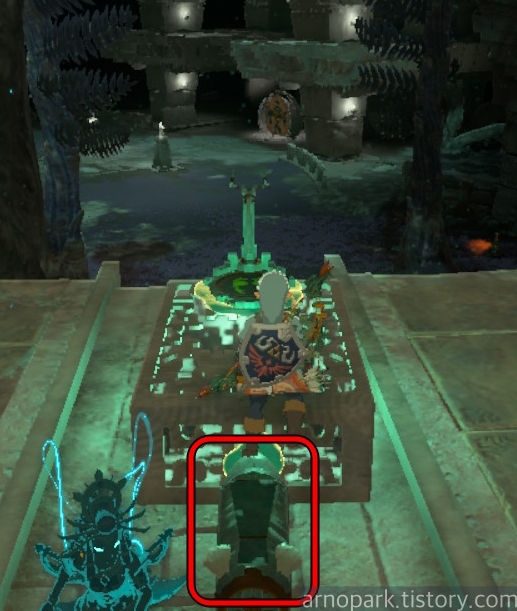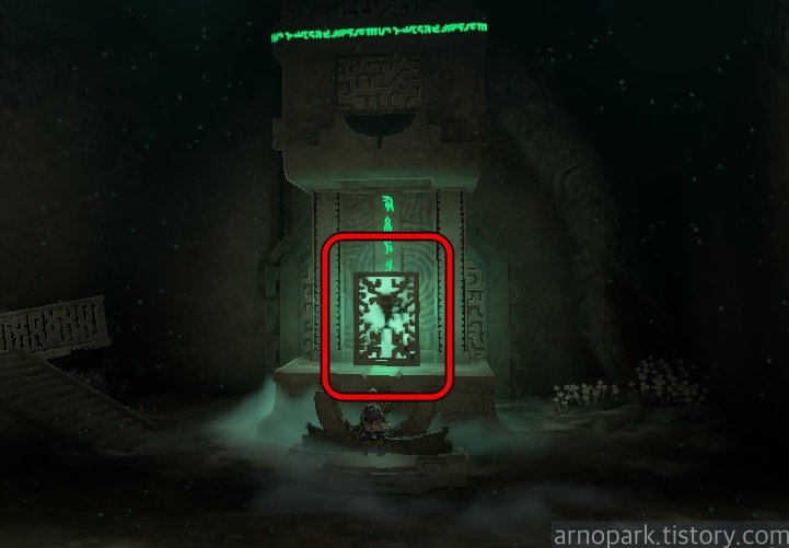 도착하면, 빛이 나오는 장치를 떼서 석상 근처에 가져갑니다.