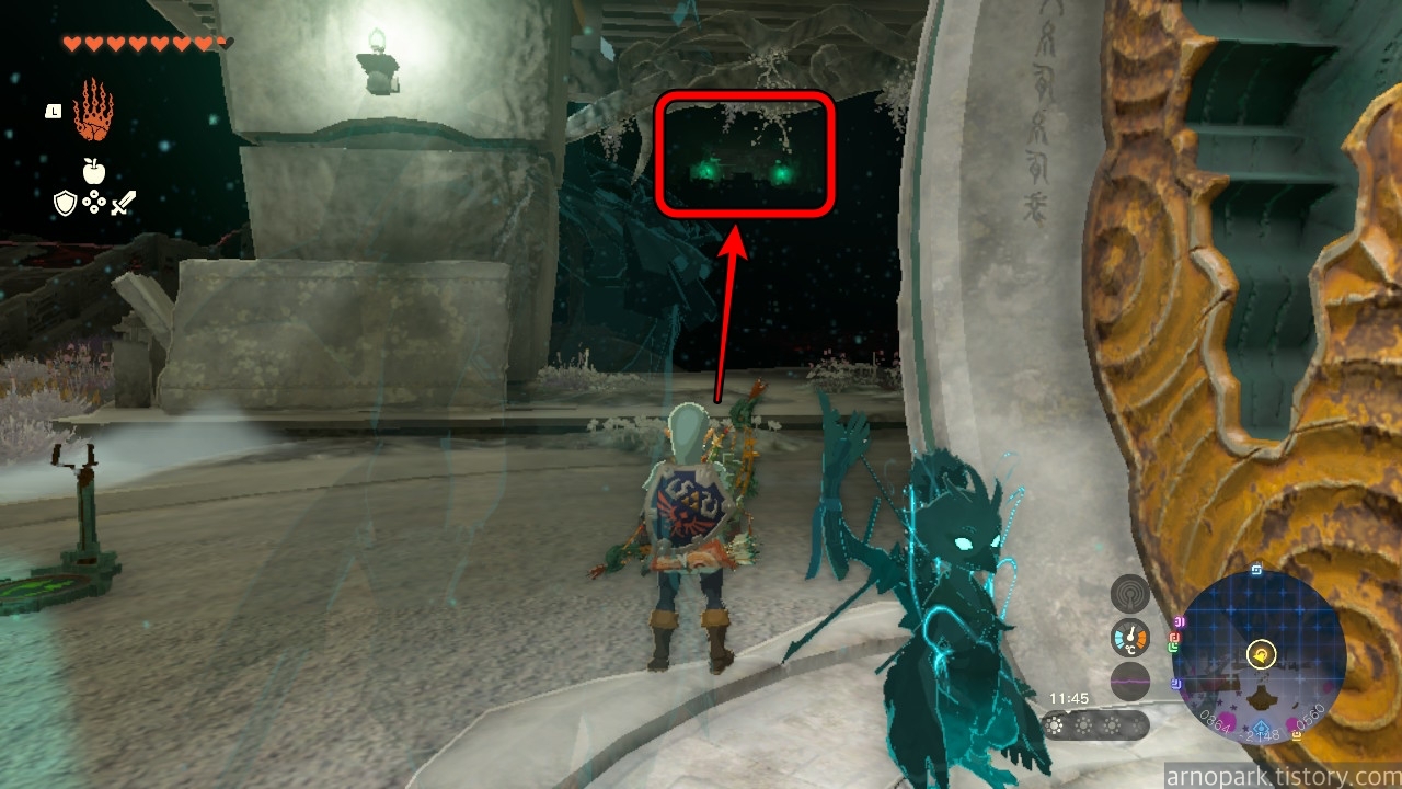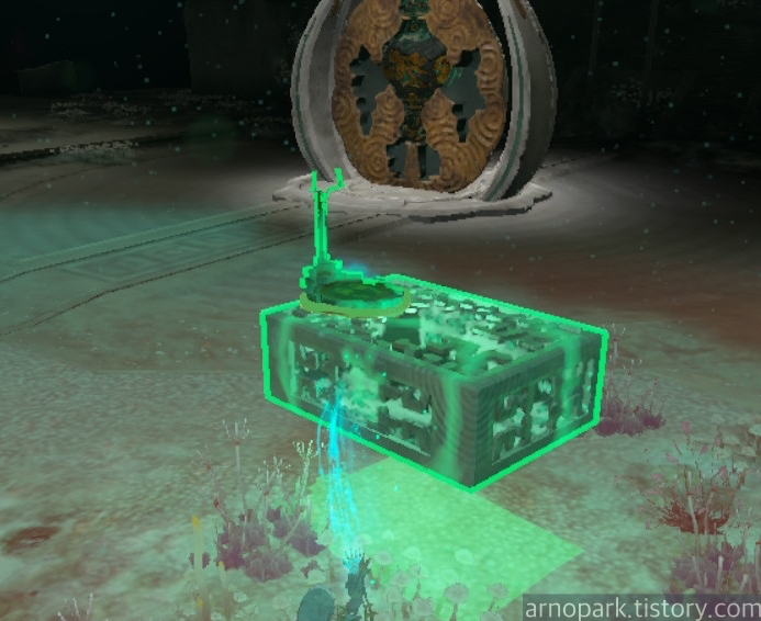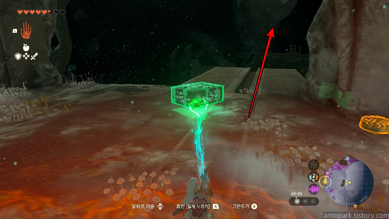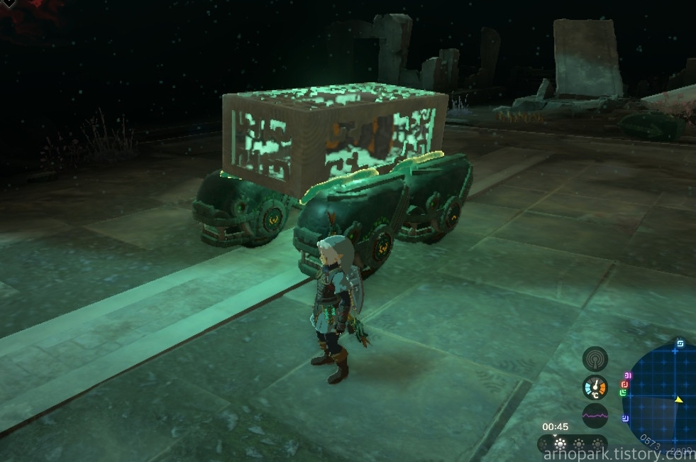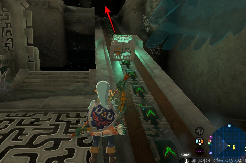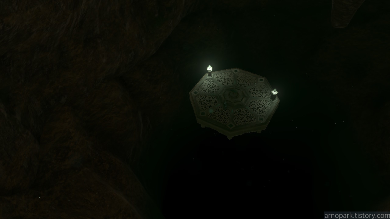 도착하면, 빛이 나오는 장치를 떼서 석상 근처에 가져갑니다.