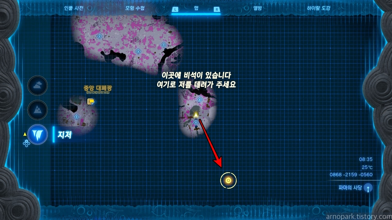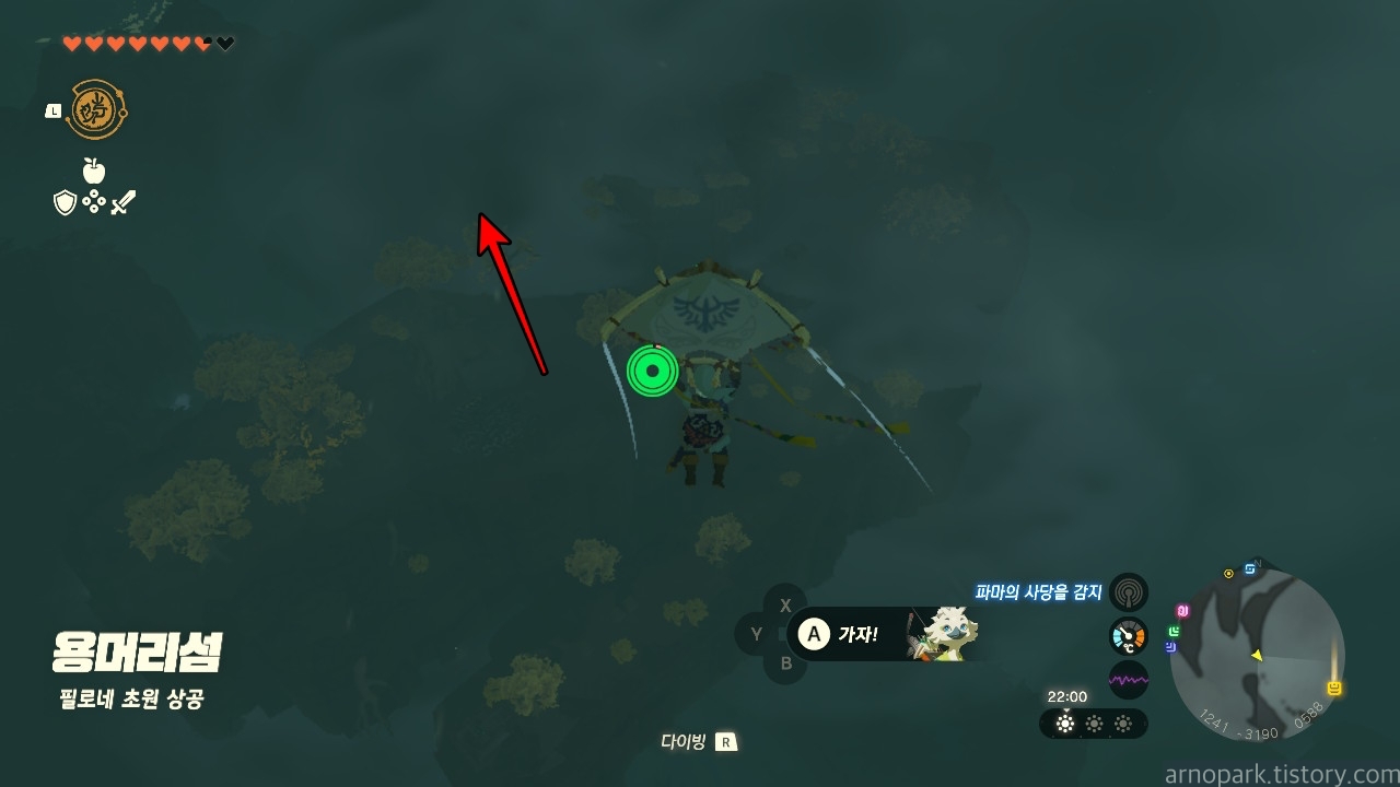 필로네 지방의 하늘지도를 살피면, 먹구름 소용돌이가 보입니다. 이 안으로 가야합니다.