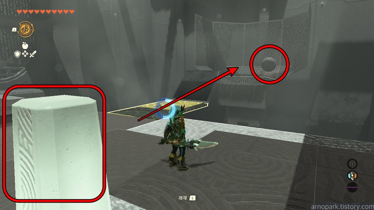 막대를 쳐서, 공을 굴리게 한 다음, 공을 건너편의 구멍에 넣는 것이 이번 사당의 핵심 기믹입니다.