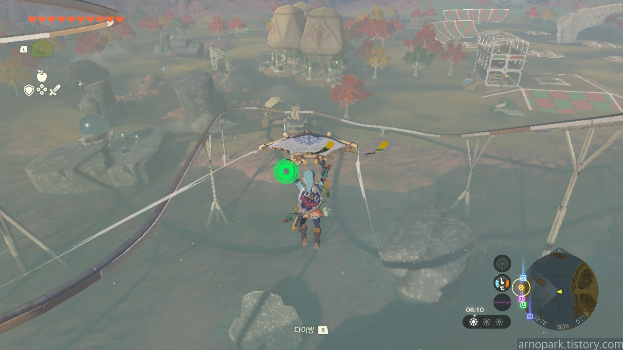링크는 패러세일을 타고 작업장으로 내려갑니다.