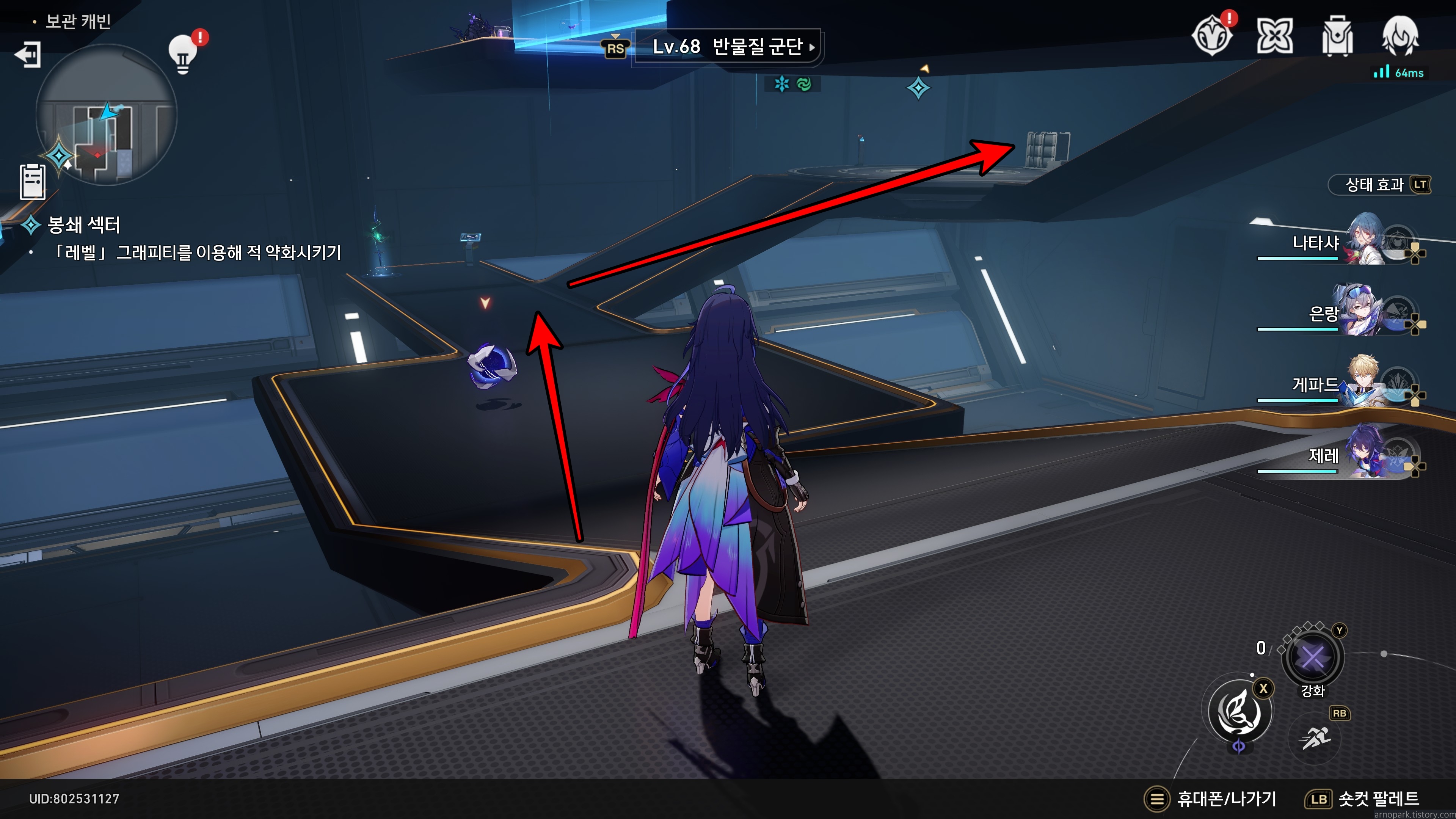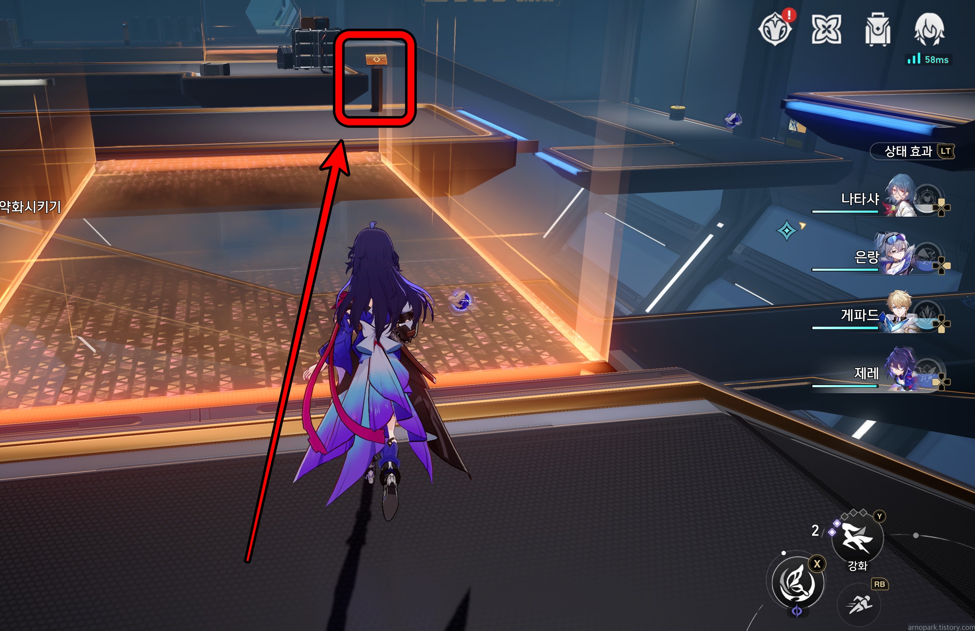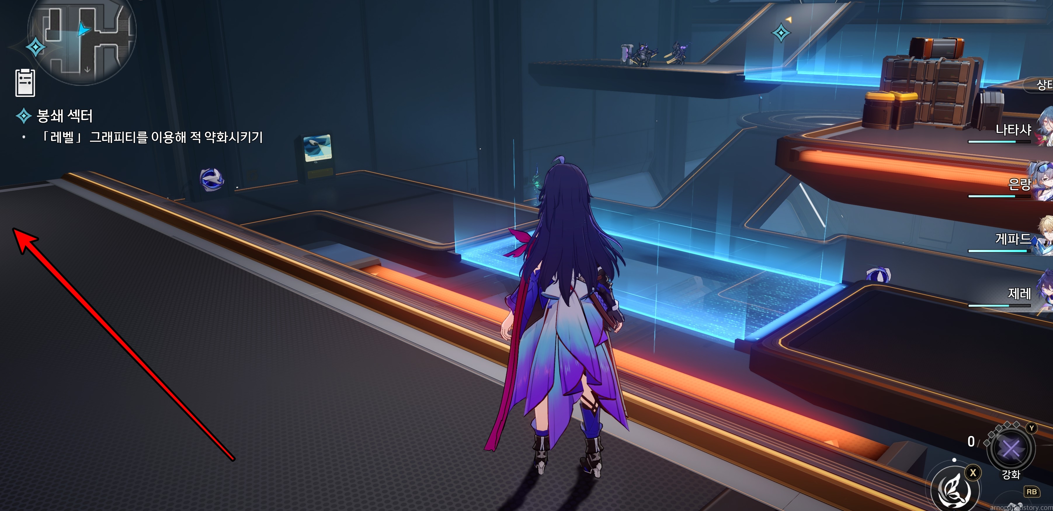 파란 다리를 활성화한 후, 사진의 화살표를 따라 이동합니다.