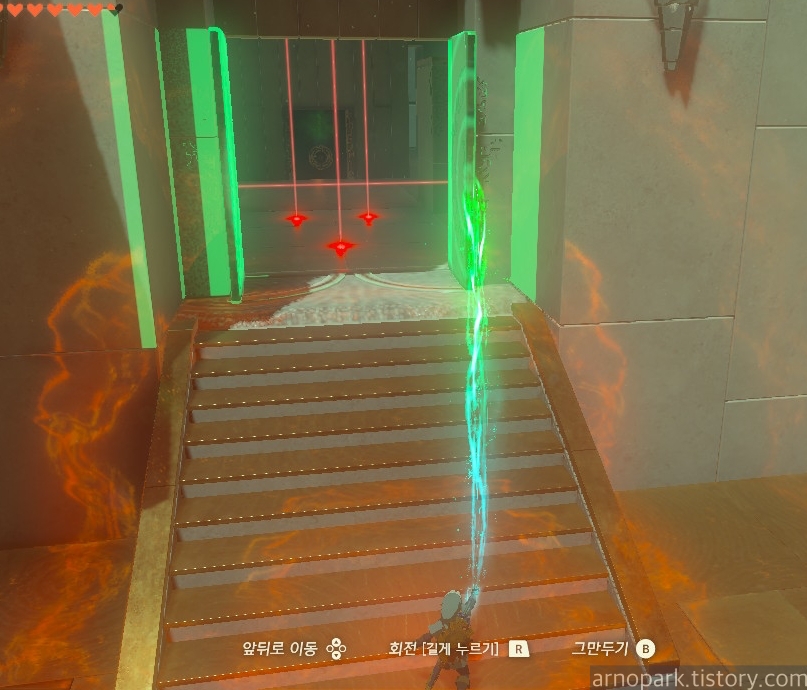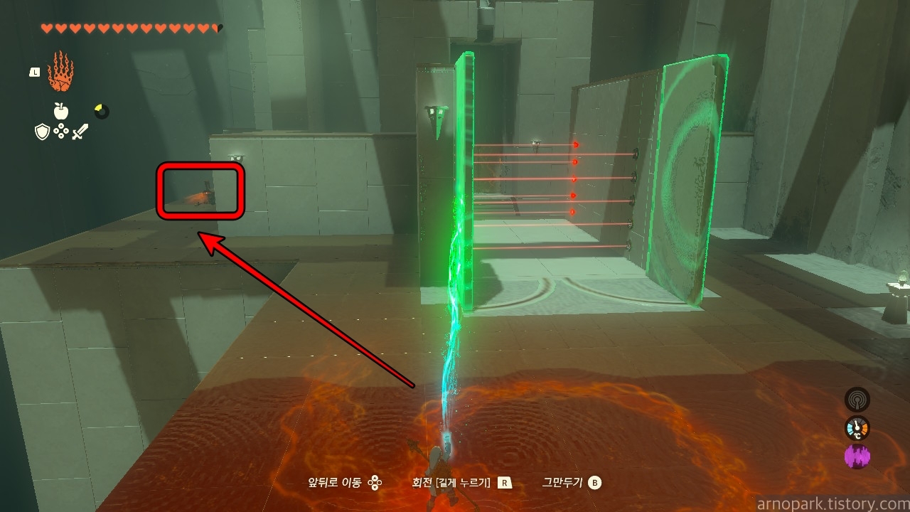 하지만 문을 열면 레이저 장애물이 있습니다. 왼쪽으로 우회해서 가겠습니다.