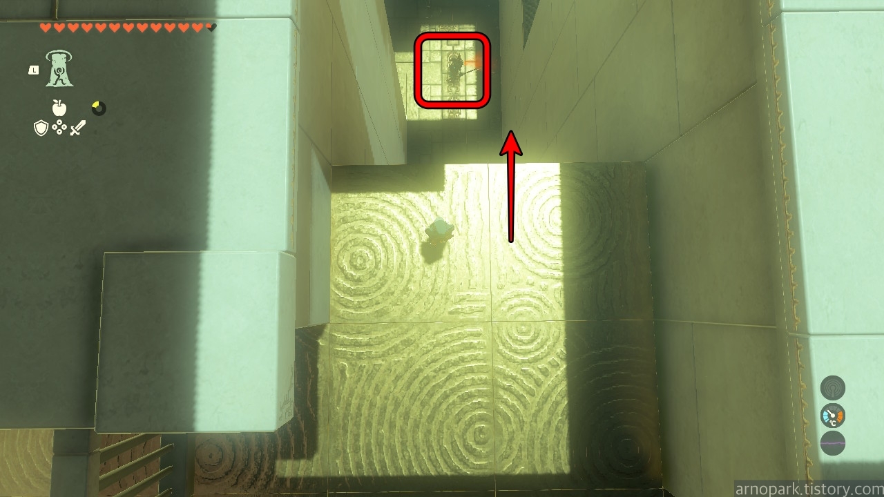 사다리를 타고 올라간 후, 몸을 숙여서 (R스틱 누르기) 구멍 안으로 들어갑니다.