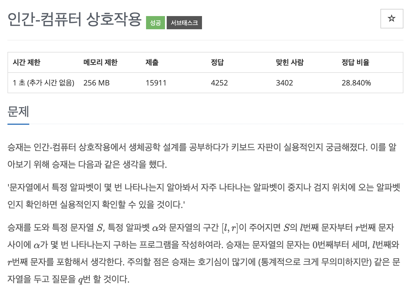 백준 16139번 인간-컴퓨터 상호작용 문제를 풀어봅시다.