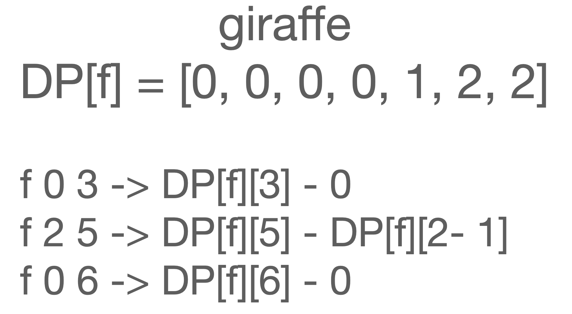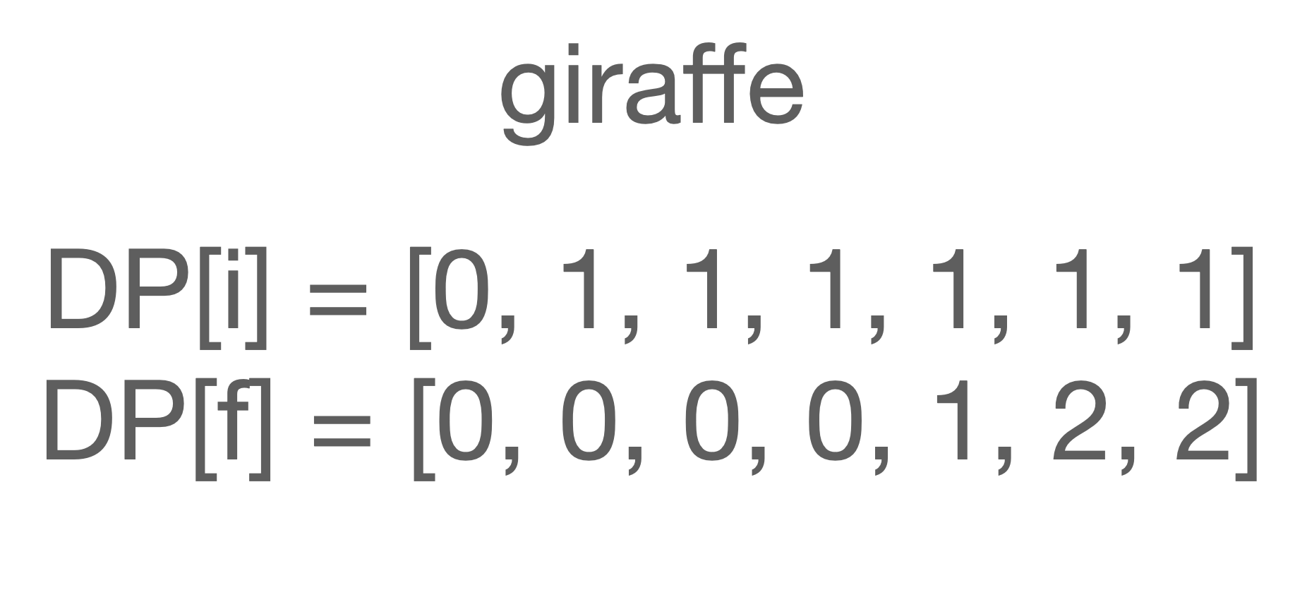 array[인덱스 번호]에는 giraffe라는 글자 중 인덱스 번호의 순서까지 총 몇 개의 똑같은 알파벳이 들어갔는지가 담깁니다.