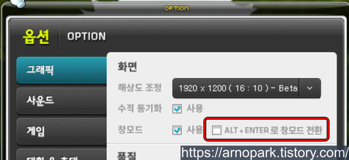 옵션 - 그래픽에서 ALT+ENTER로 창모드 전환을 체크해제하여 방지합시다.