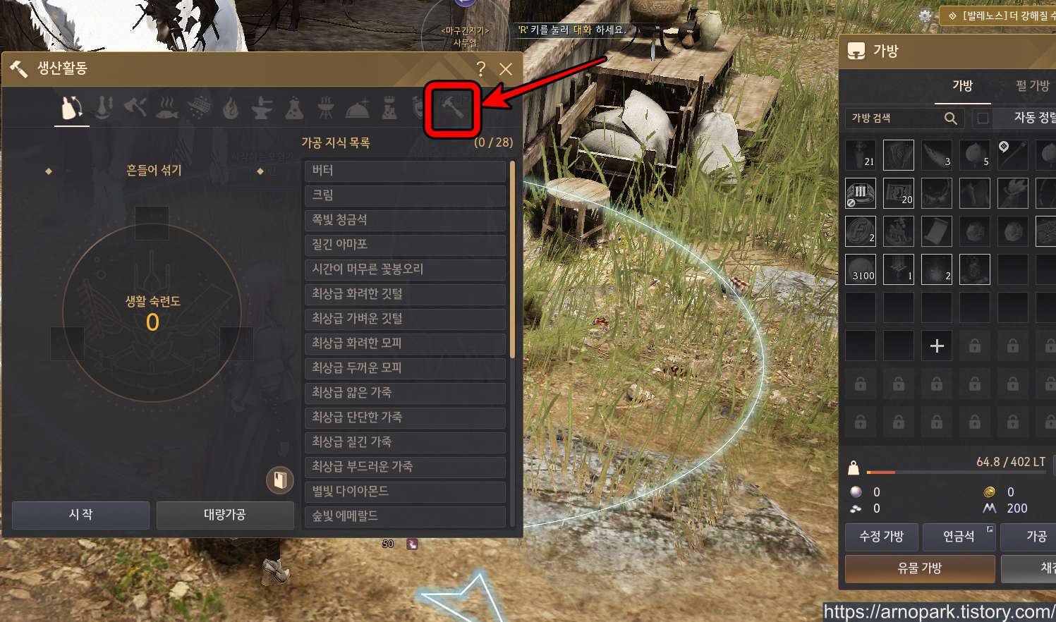 L키를 눌러서 [생산활동] 창으로 간 후, 공작 버튼을 누릅니다.