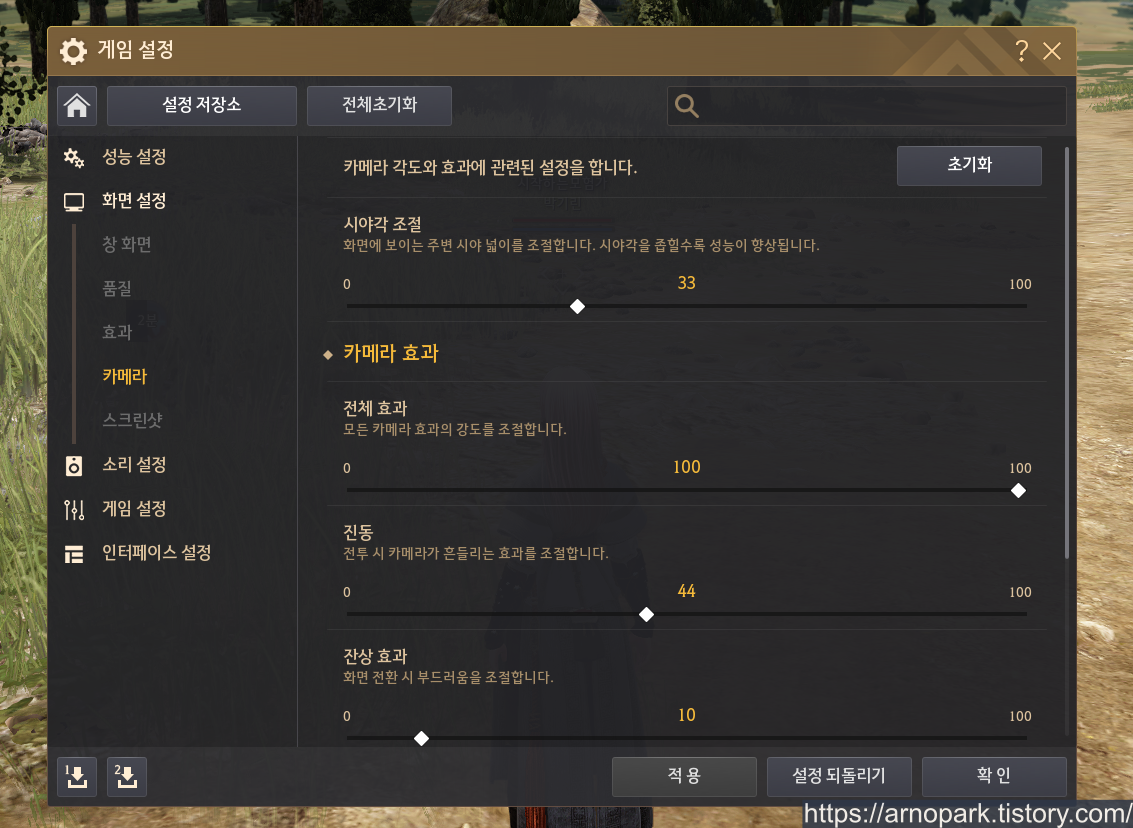 [게임 설정 - 카메라 - 시야각 조절]에서 100까지 쭉 땡깁니다.