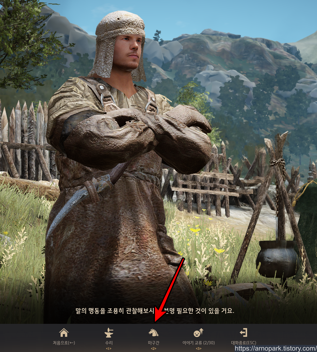 마구간지기에 말을 건 후, 마구간에 들어갑니다.