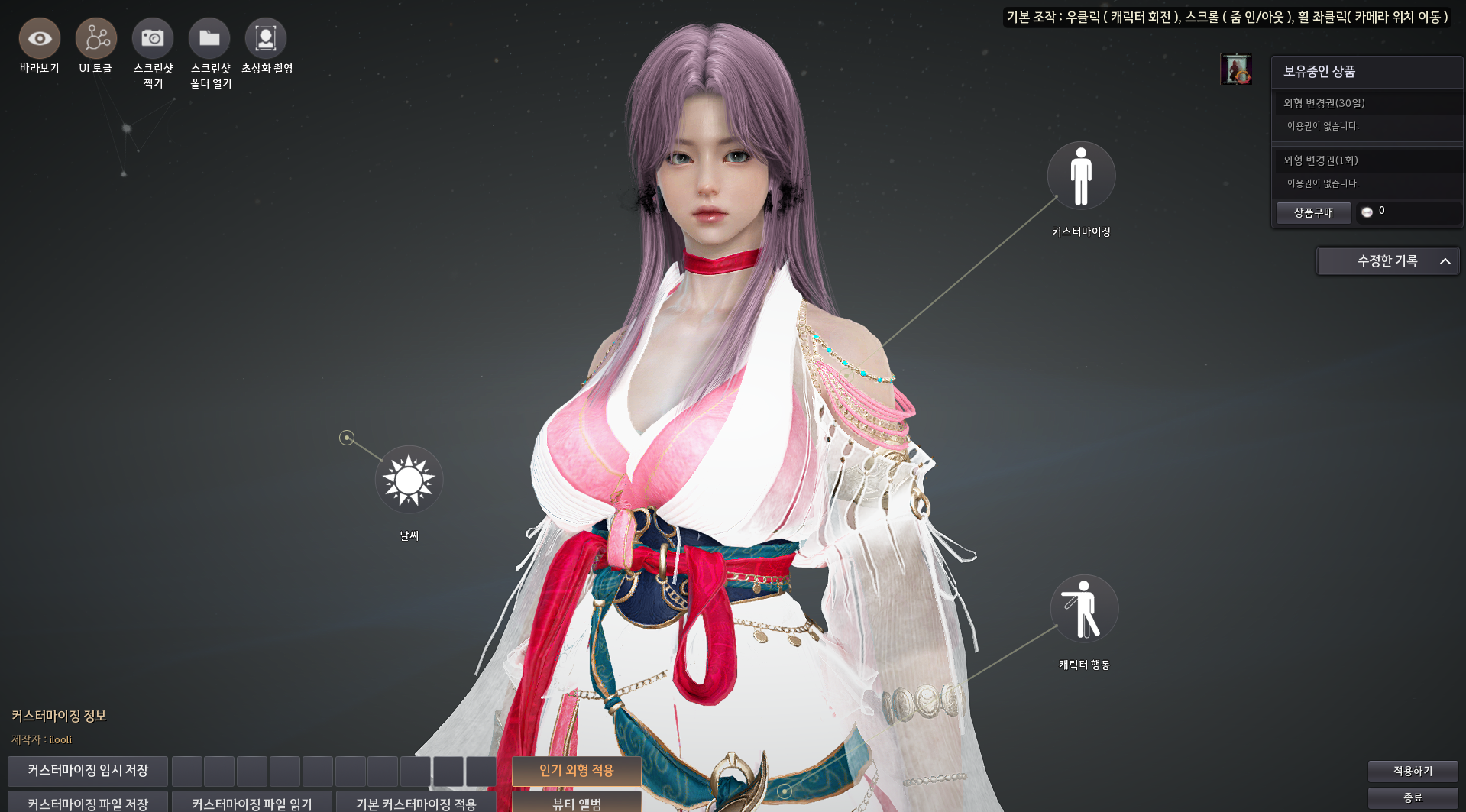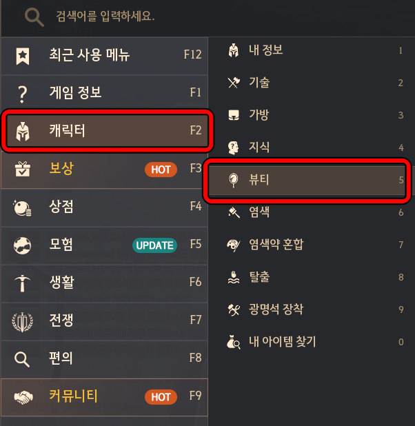 [메뉴 - 캐릭터 - 뷰티]로 들어가면 됩니다.