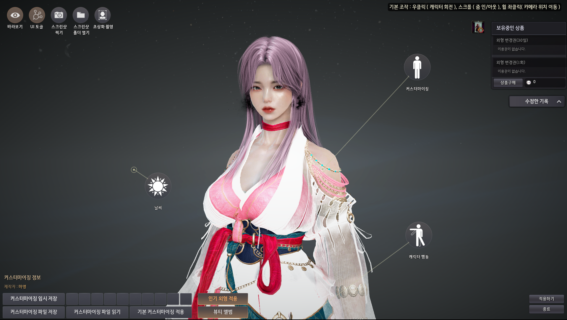 뷰티 메뉴에 들어가면, 캐릭터를 처음 만들 때 보았던 커마 모드에 들어갈 수 있습니다.