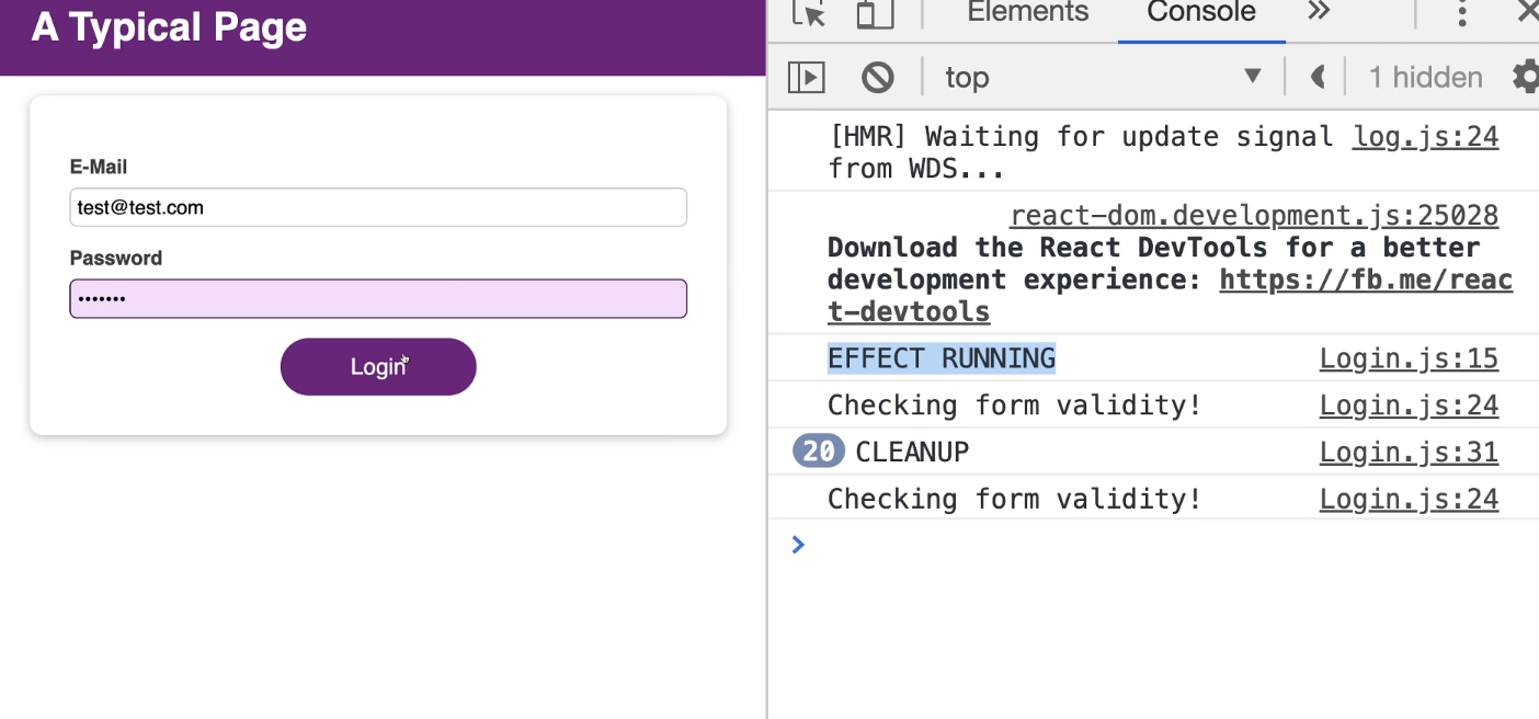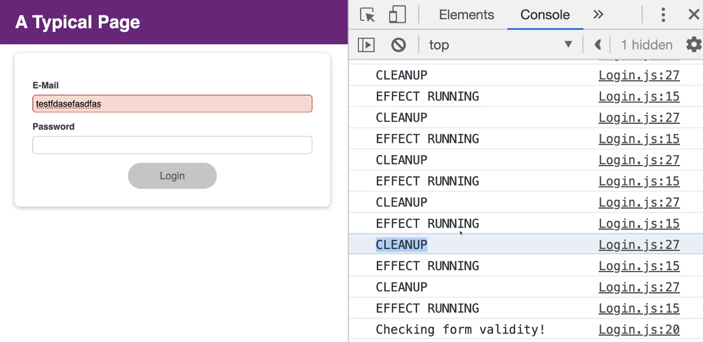 컴포넌트가 처음으로 등장할 때, 이메일과 비밀번호 입력에 의한 컴포넌트 재렌더링 등 어떤 경우에도 'EFFECT CLEANUP' 콘솔이 찍히지 않습니다.