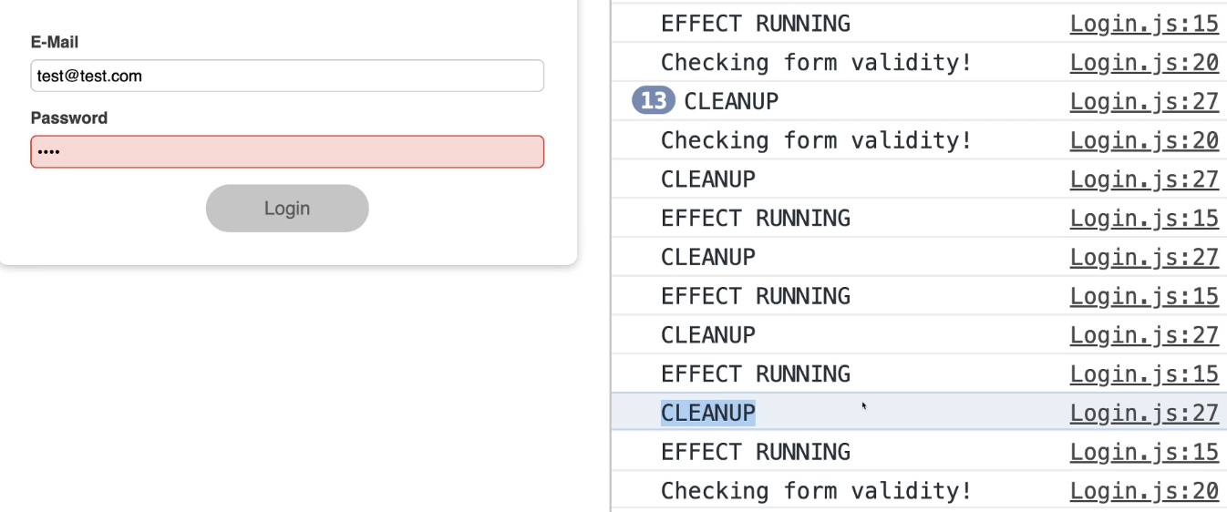 하지만 Password를 치기 시작하면, 키보드 입력과 동시에 enteredPassword state가 변경되고, 변경된 state를 반영하기 위해 컴포너트가 재실행 될 때마다, 클린업 함수가 실행됩니다.