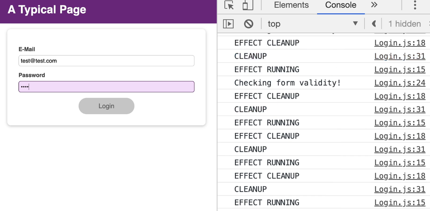 로그인 컴포넌트가 첫 등장했을 때 콘솔이 찍히고, 의존성 배열에 든 enteredPassword의 값이 변경될 때마다 콘솔이 찍힙니다.