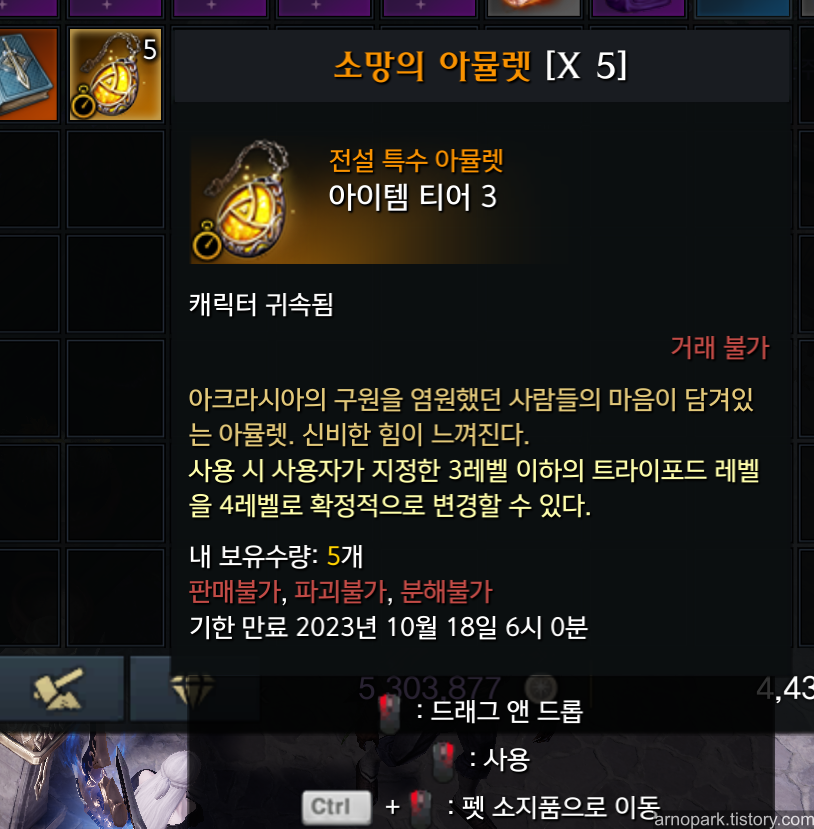 보상으로 받은 소망의 아뮬렛을 써서, 슬레 주력기의 트포작을 해줍니다.