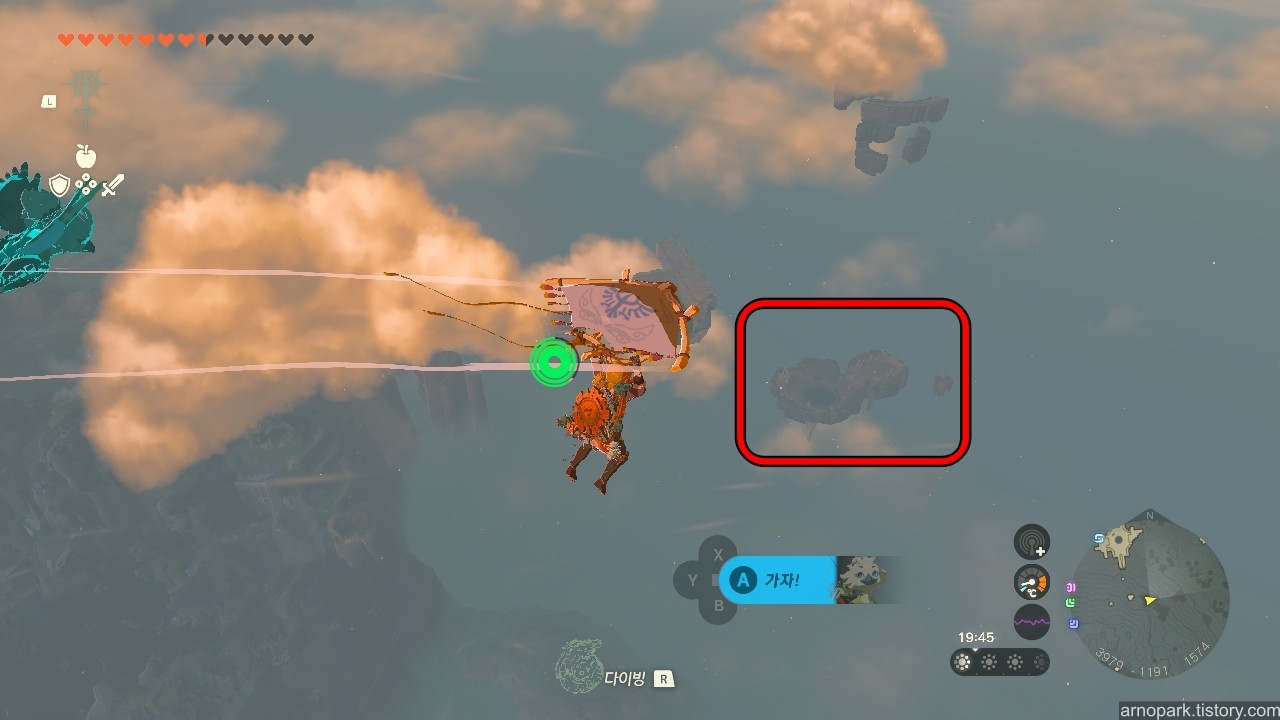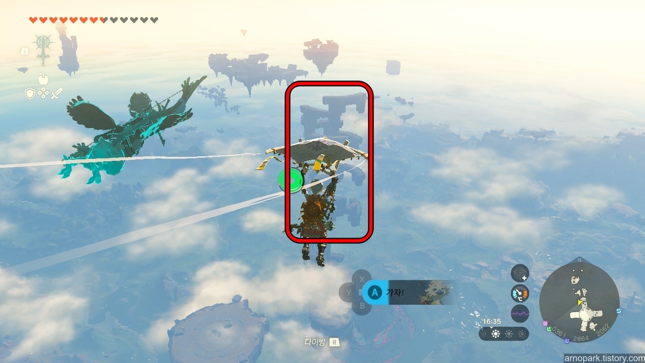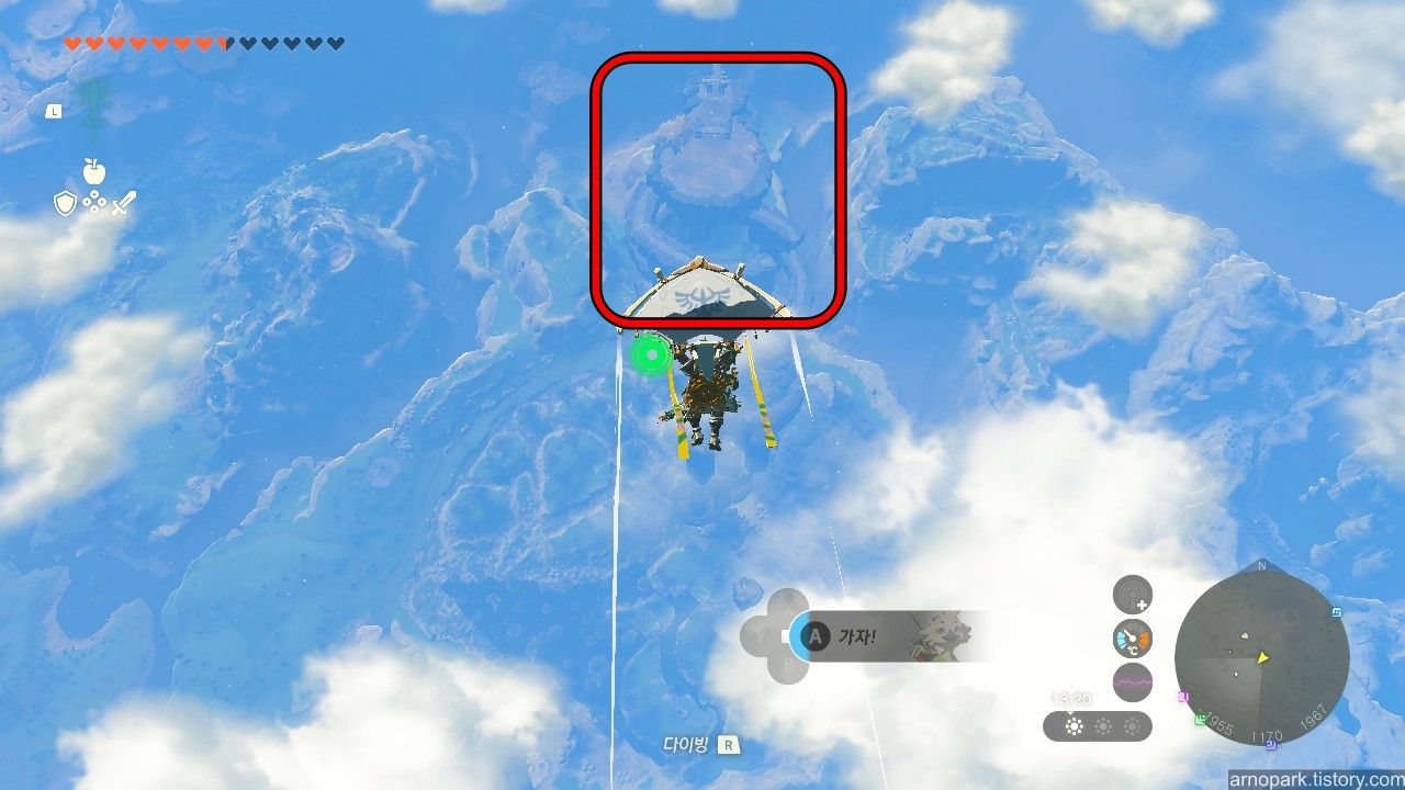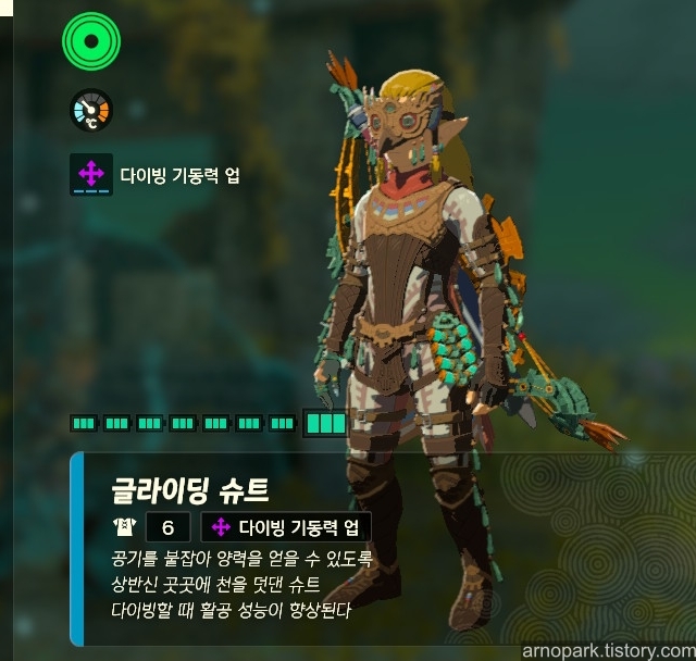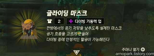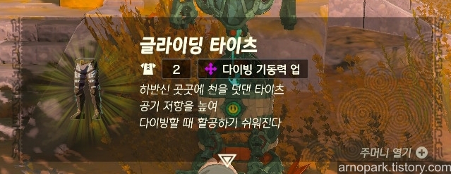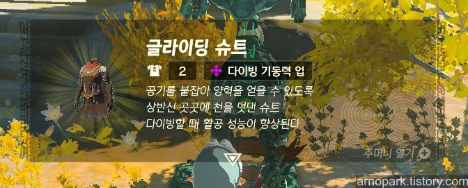 글라이딩 세트를 얻고, 빠르게 2레벨 세트 강화를 해서, 자유롭게 하이랄의 하늘을 날아다니세요!