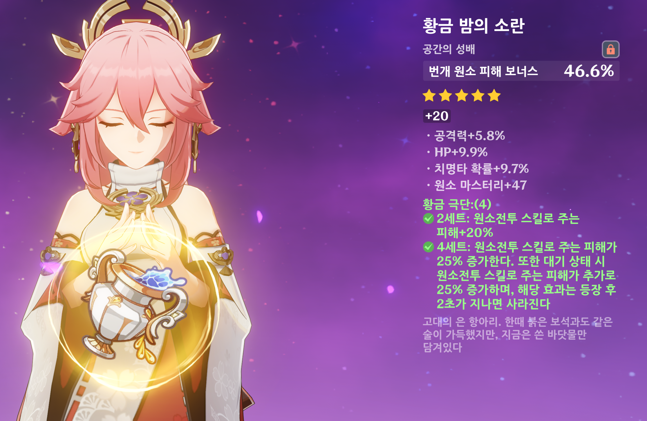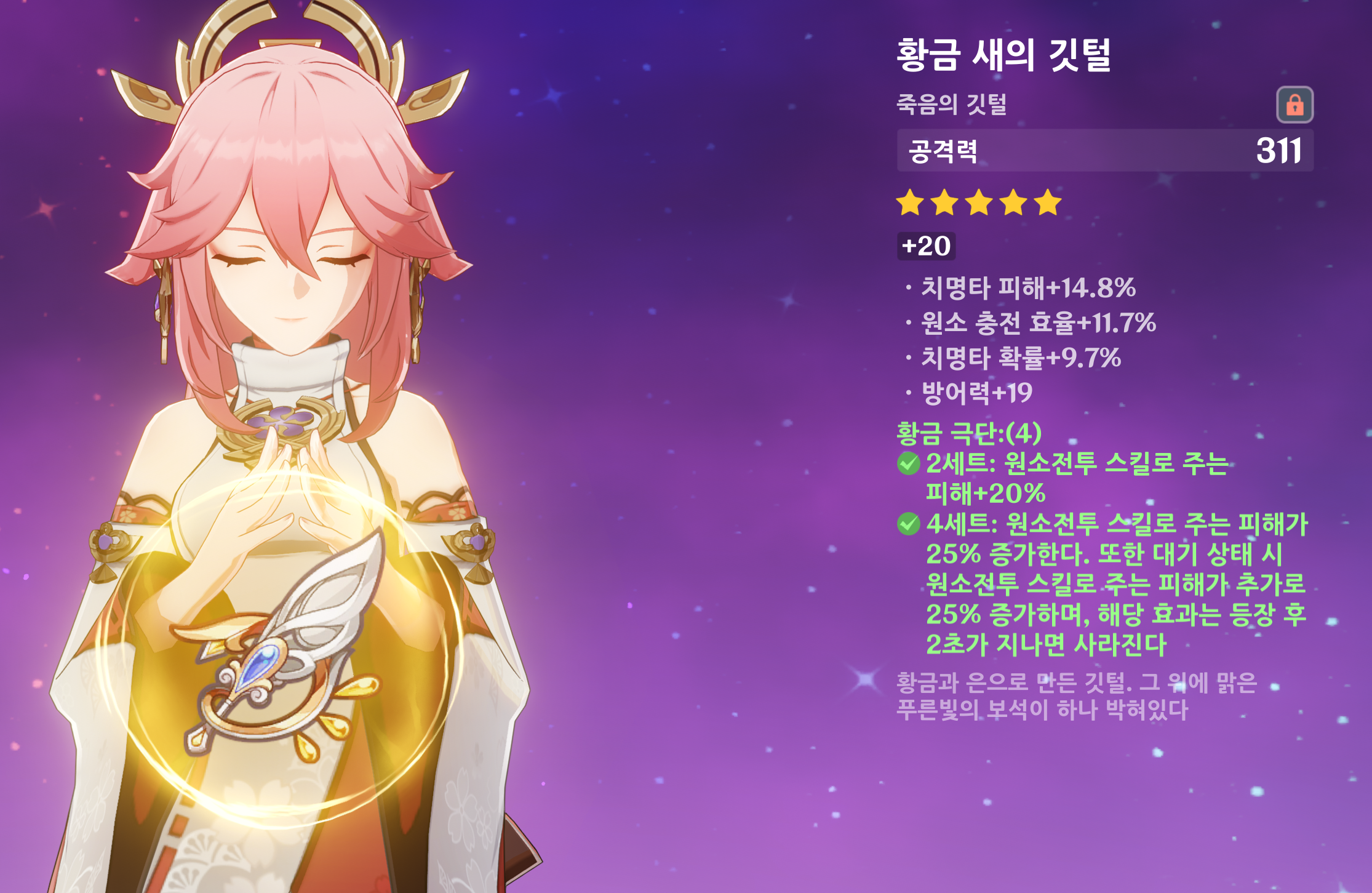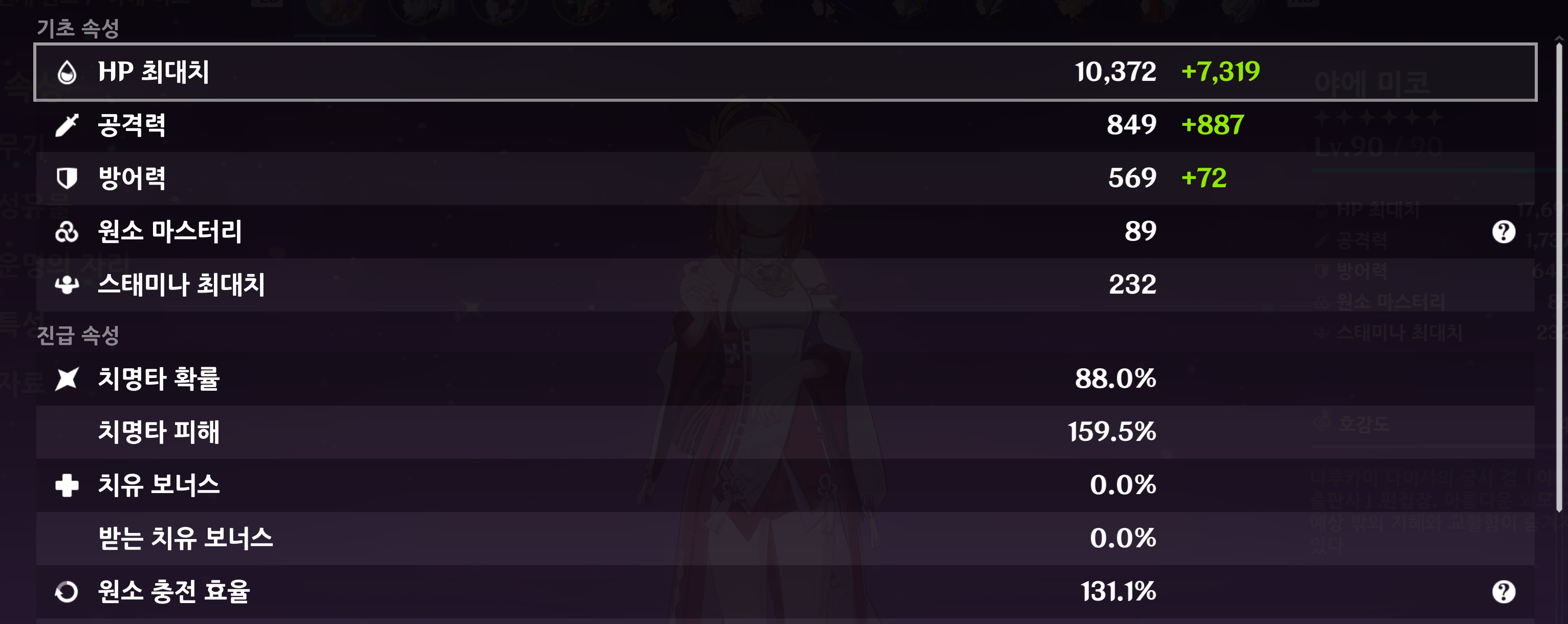 풀 원소 반응에 좋은 야에 미코의 세팅을 어느정도 맞췄습니다. 제 세팅을 공유해보겠습니다.