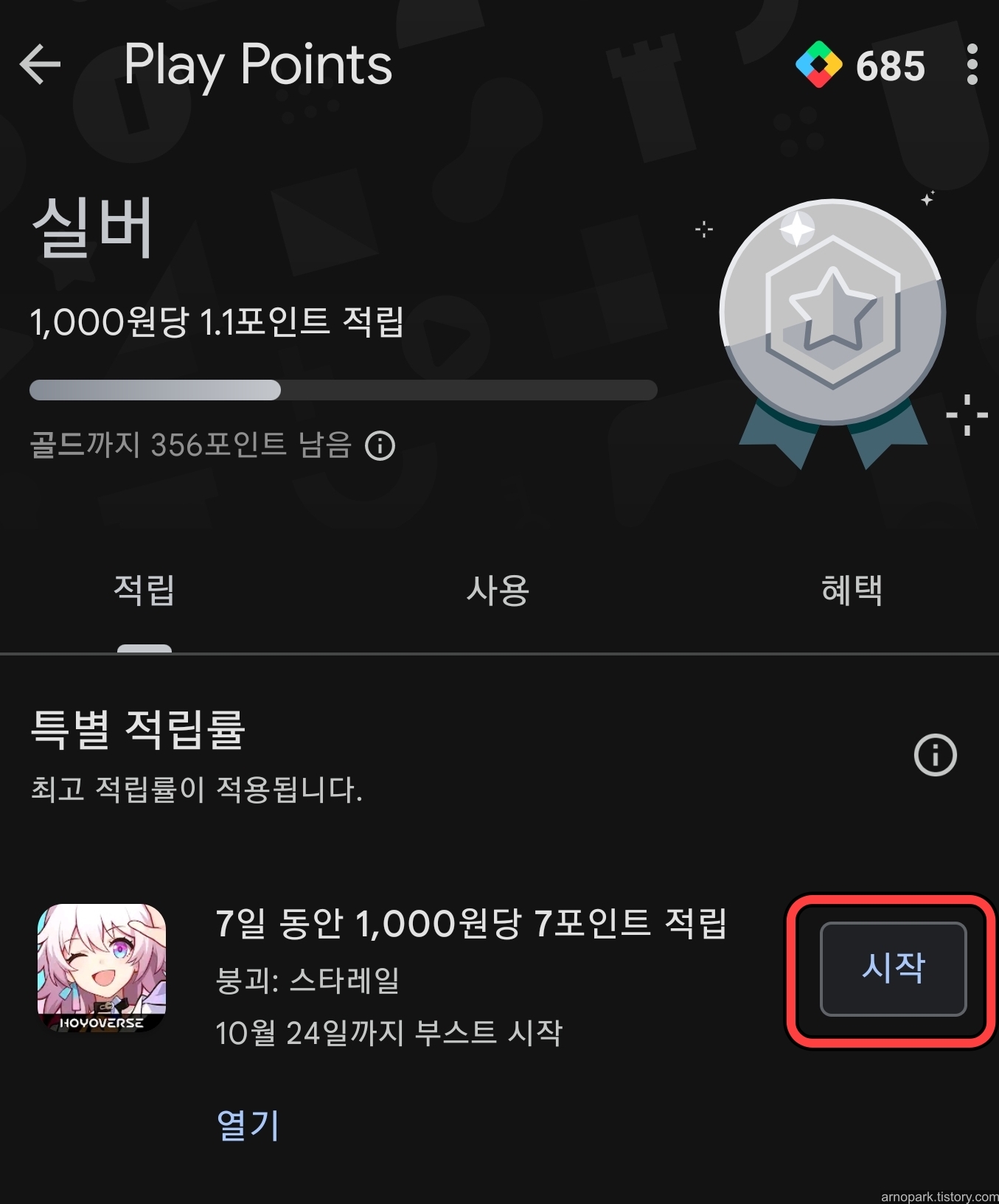 그리고 이 적립 혜택을 받으려면, '시작' 버튼을 눌러야만 합니다.