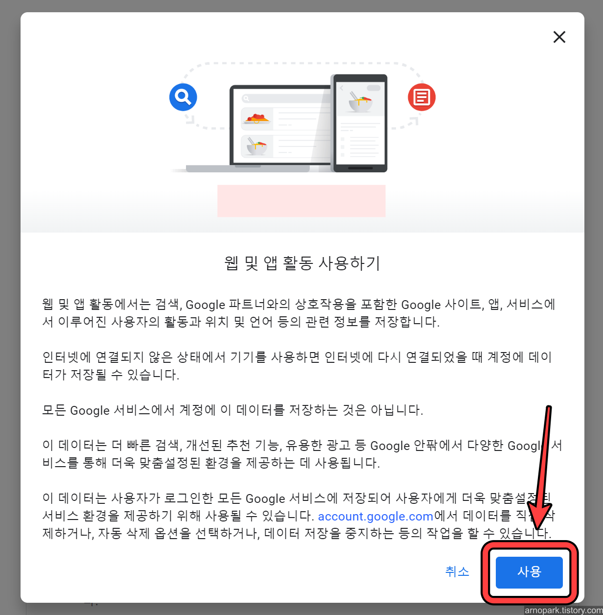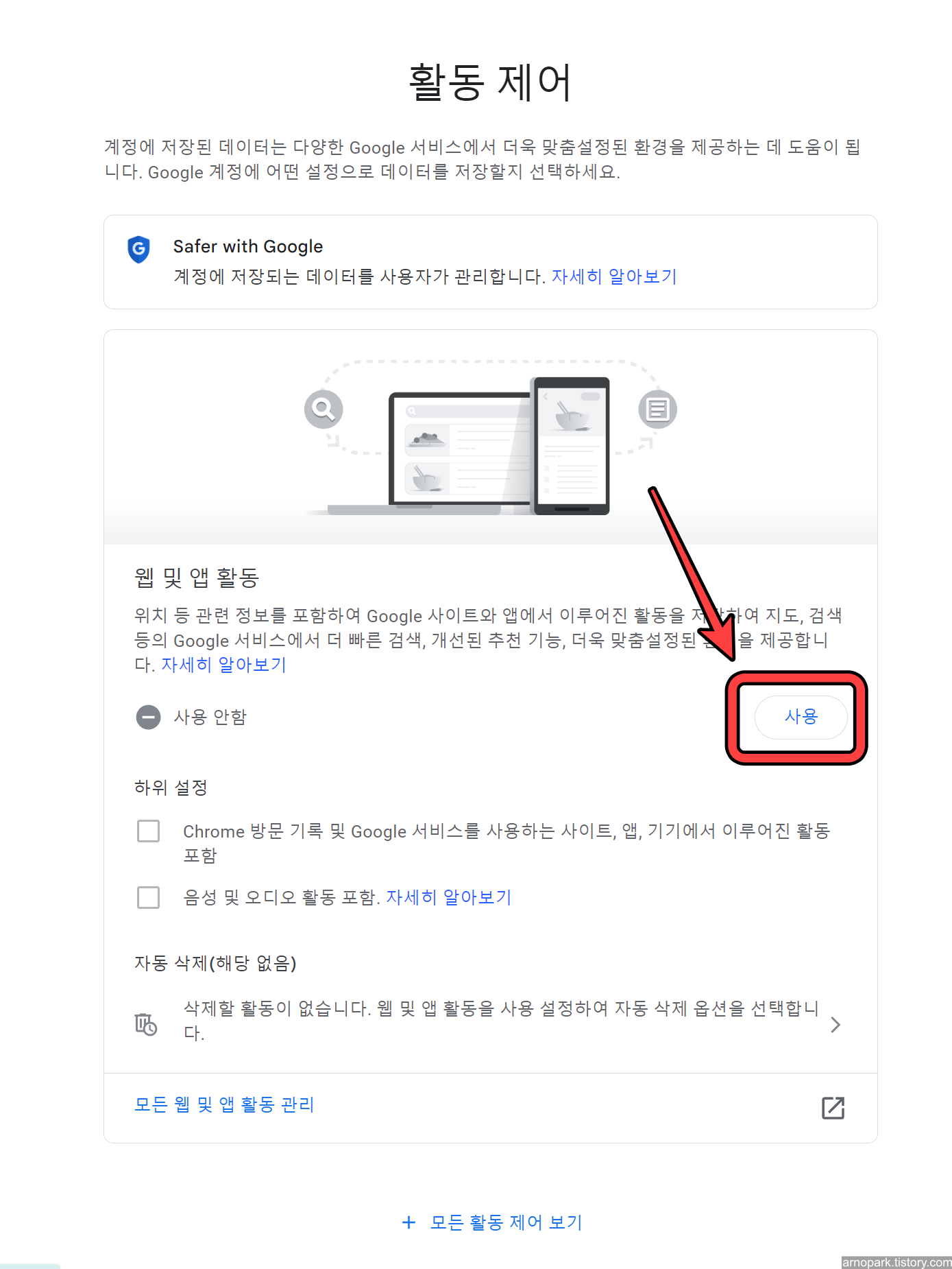 웹 및 앱 활동 저장이 켜지면, 이제 끝입니다.