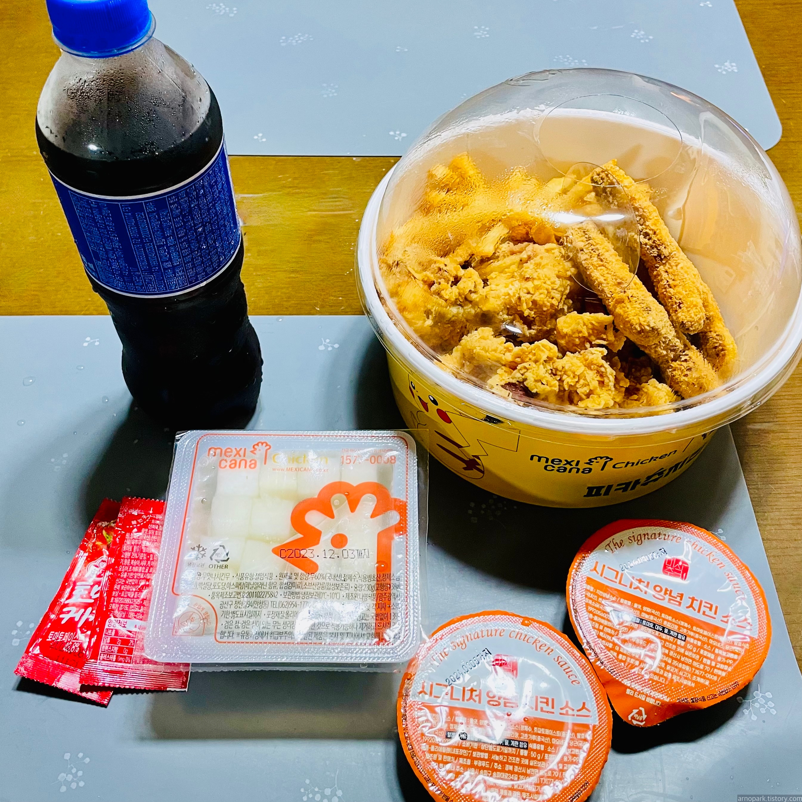 치킨의 식감은 정말 괜찮았습니다. 맛잘알은 아니라서 정확한 분석일지는 모르겠지만, 딱 기본적인 후라이드 치킨의 맛이었습니다. 옛날에 맘스터치 모코코 치킨세트에서 먹은 맘터 치킨과 비슷한 느낌이었습니다.