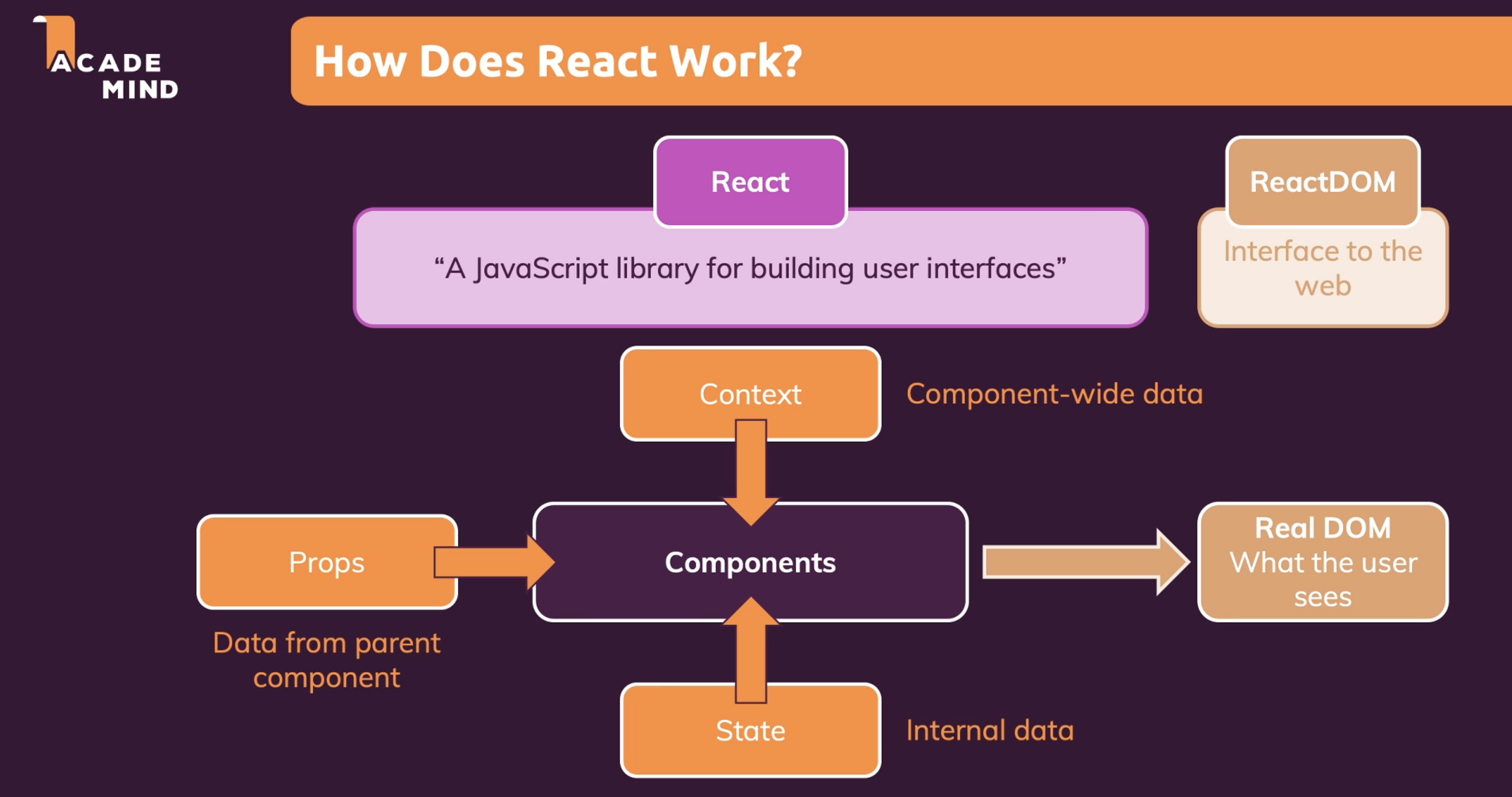리액트(React) 자체는 웹에 대해 모릅니다. 웹페이자 상에서 어떻게 표시되는 지에 대해서 관여하지 않습니다.