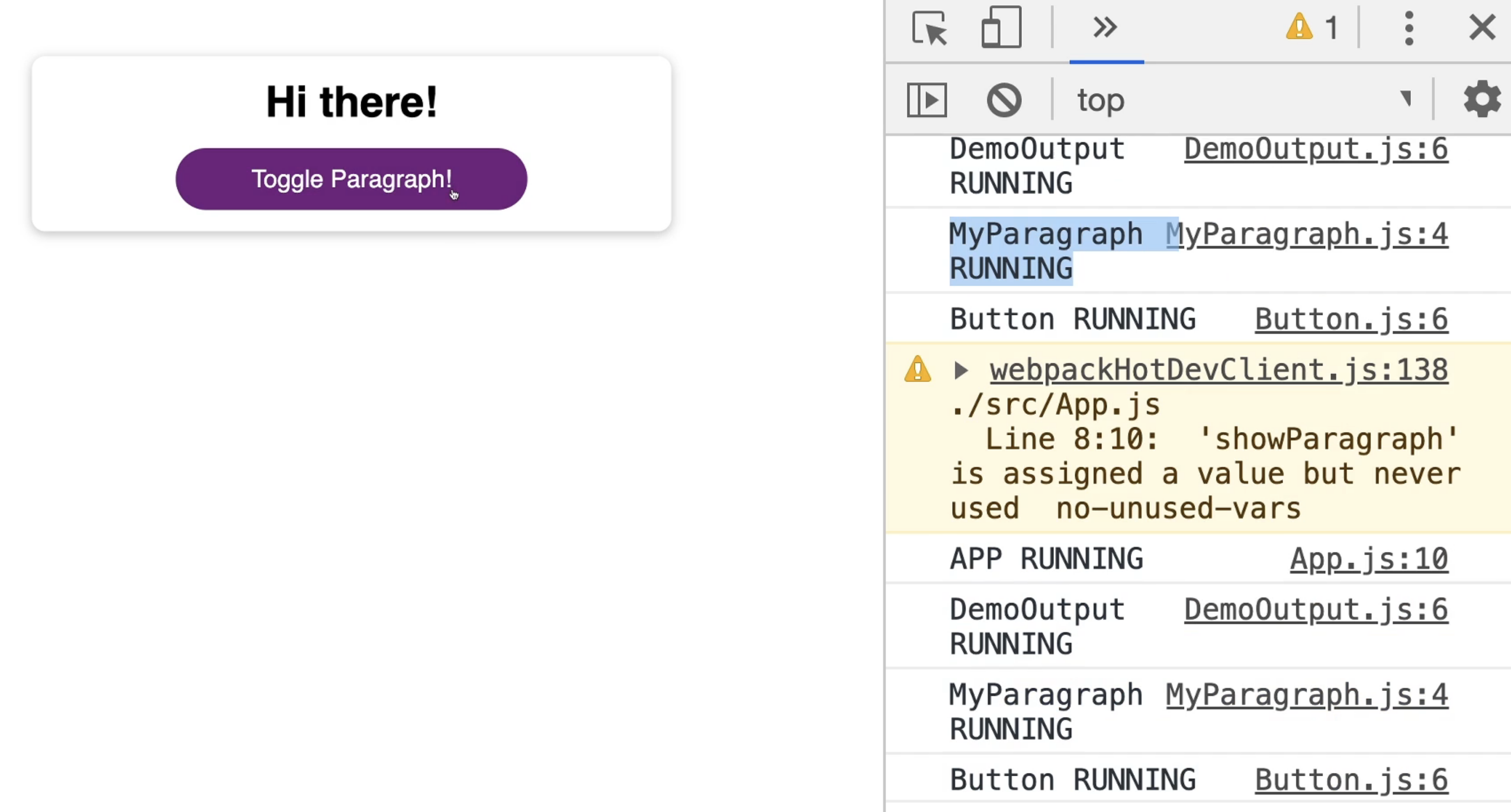 그 후 <Toggle Paragraph!>를 눌렀더니, 콘솔에는 여전히 'Button RUNNING' 콘솔이 찍힙니다.