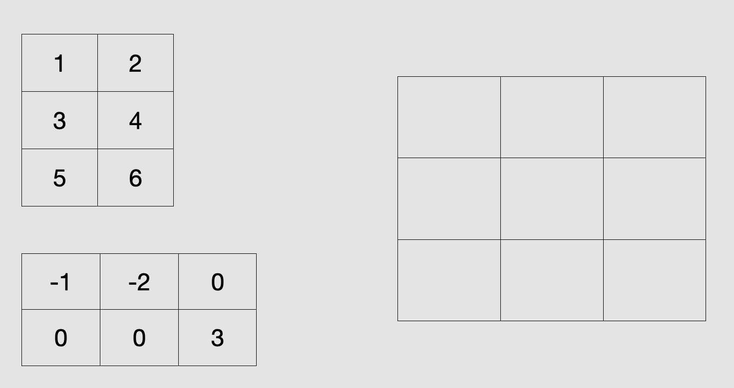 [3 * 2] 와 [2 * 3]으로 이루어진 행렬이고, N은 3, M은, K는 3입니다.