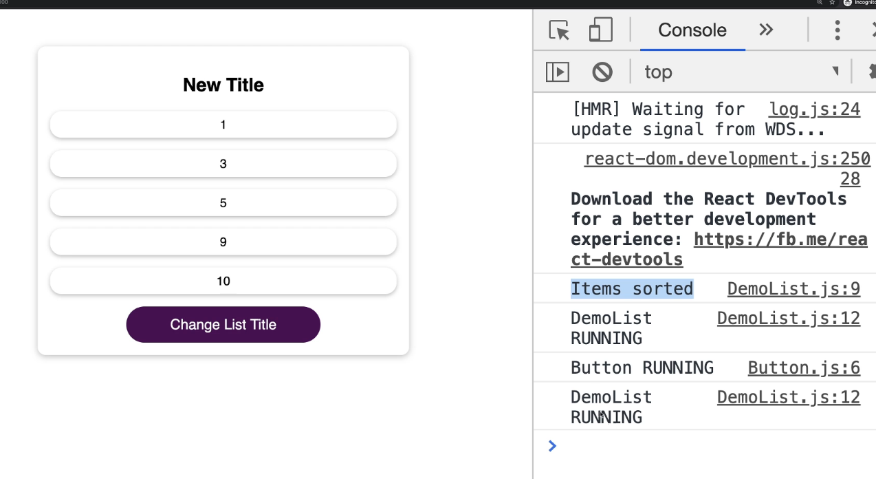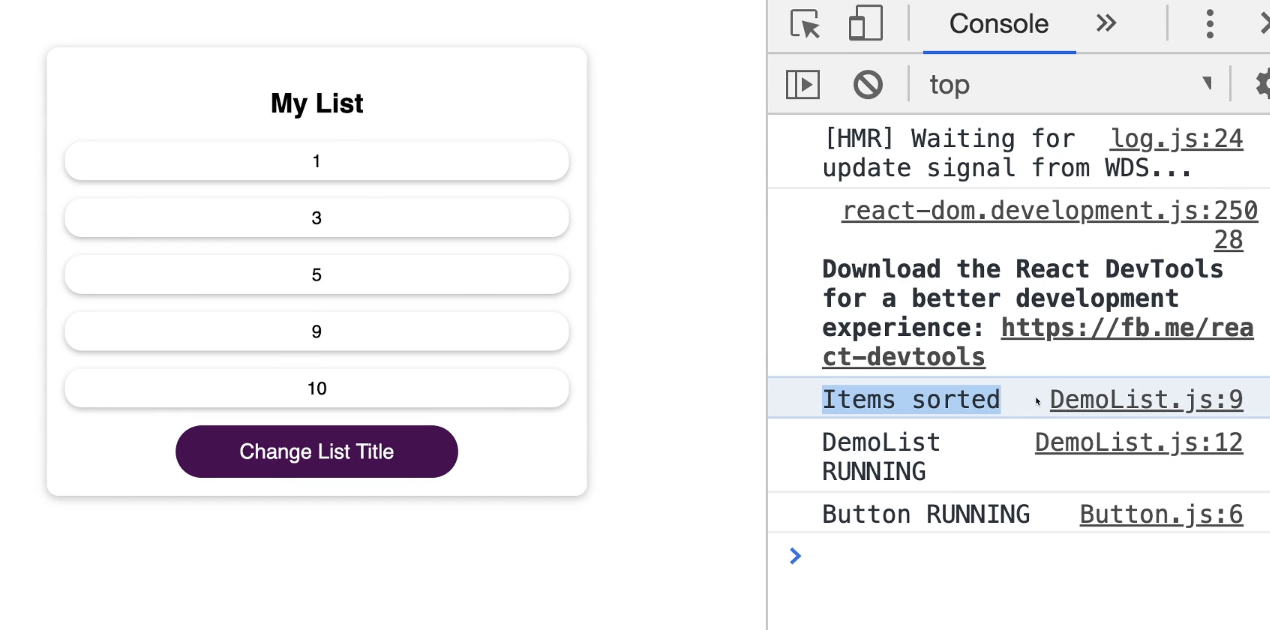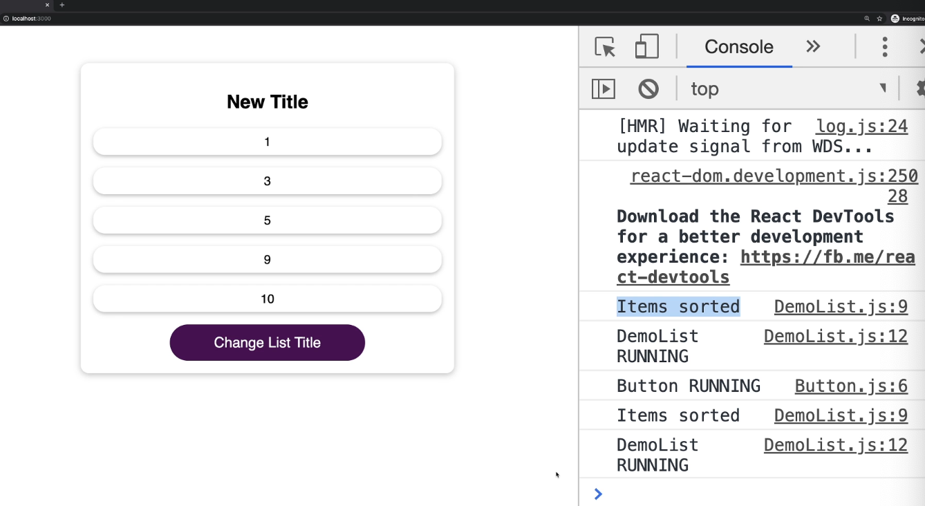 만약 DemoList.js가 계속 재실행된다면, 위의 sort()함수도 계속 재실행될 것입니다. 규모가 작은 array라면 큰 문제가 안 생기겠지만, 규모가 커질수록 분류작업에 시간과 자원이 몇 배는 더 쓰일 것입니다. 결국 성능 저하 문제가 심각해집니다.