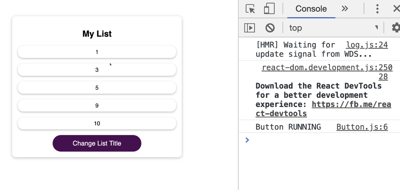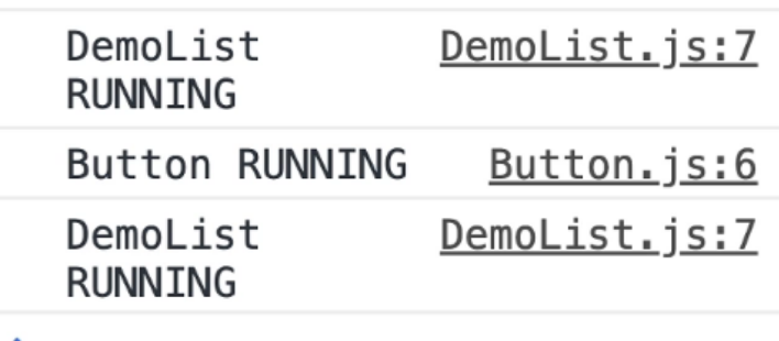 버튼을 누르면서 listTitle state가 변경됐고, listTitle을 prop으로 전달받는 DemoList.js가 재실행됐습니다. 그래서 콘솔에는 "DemoList RUNNING'이 다시 한 번 기록됐습니다.