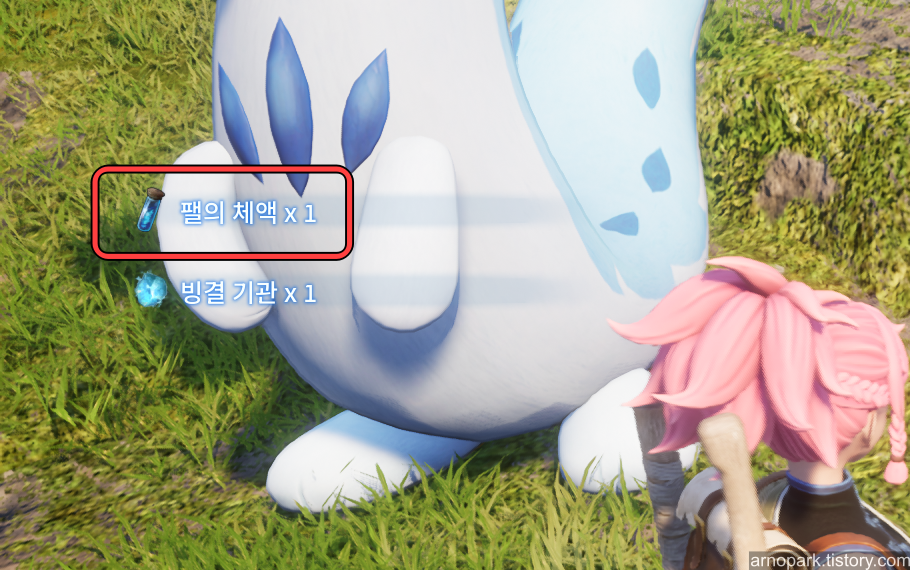 팰의 체액을 얻는 방법은 '물 타입 팰'을 죽이기 입니다.