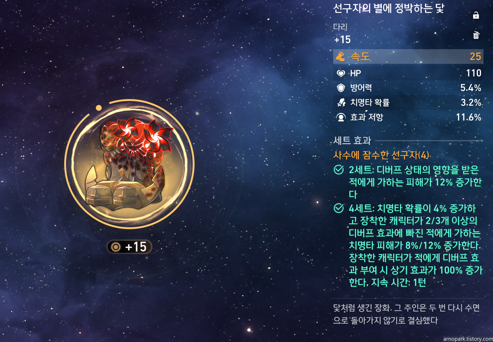 회전을 멈춘 살소토 : 치명타 확률을 제공하며, 아케론의 주 딜링기인 필살기의 딜량을 높여줍니다. 신국 세트가 덜 파밍된 상태라면 채용하기 괜찮습니다.