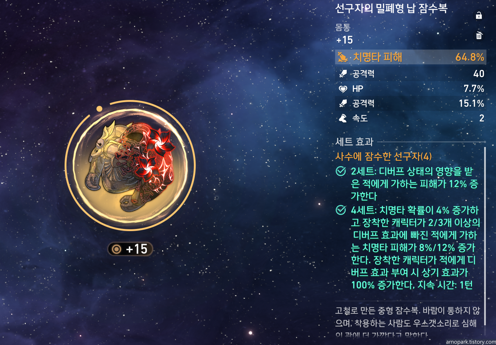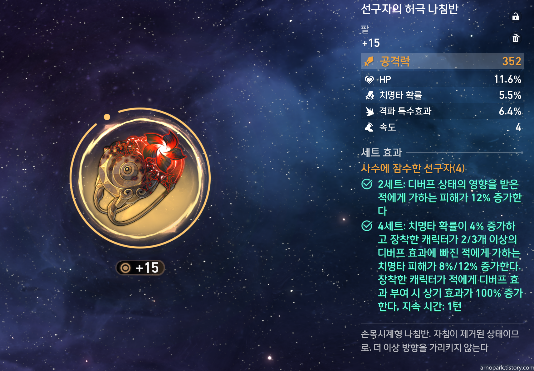 사수에 잠수한 선구자 4세트 : 디버프 효과를 가진 적에게 '적에게 가하는 피해', '치명타 확률', '치명타 피해'를 증가시키는 유물로, 아케론에게 있어서 최적의 유물 세트입니다. 다른 유물 세트를 생각할 필요 없이, 꼭 선구자 4세트를 맞춥시다.