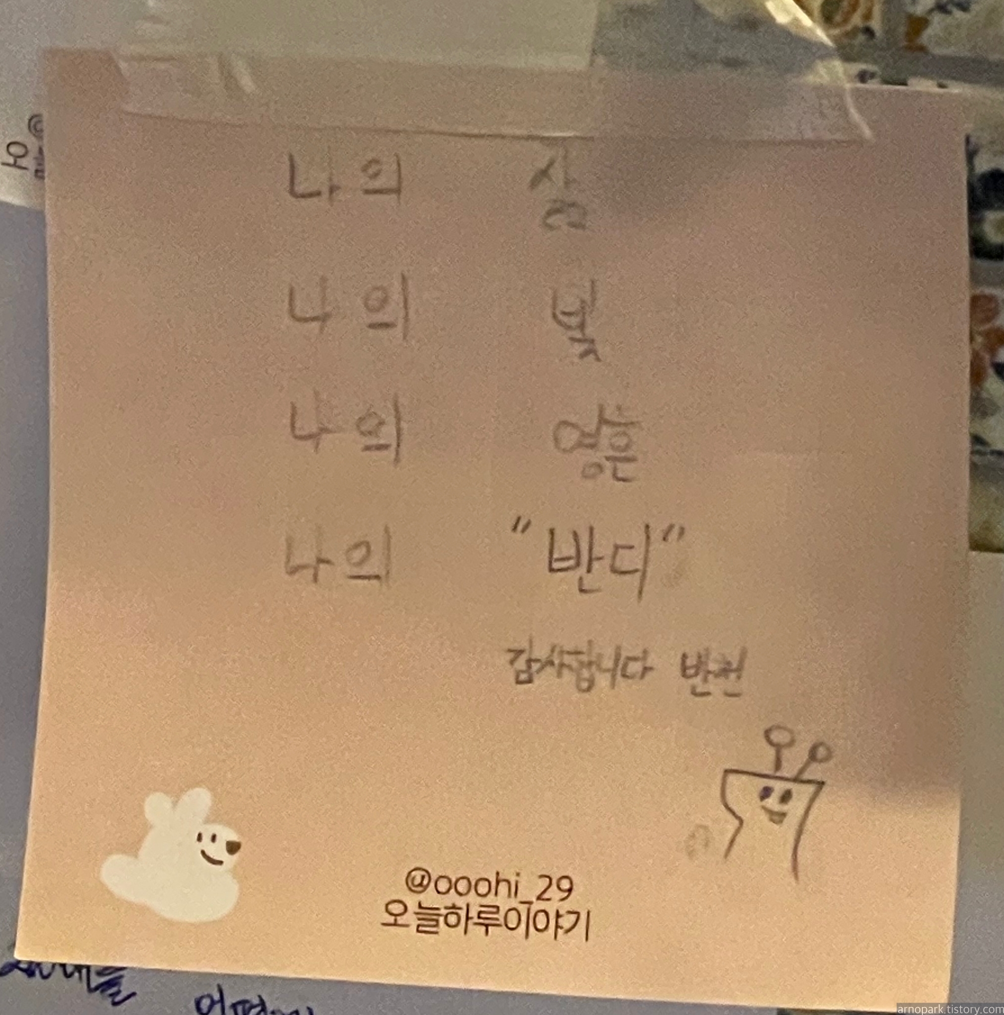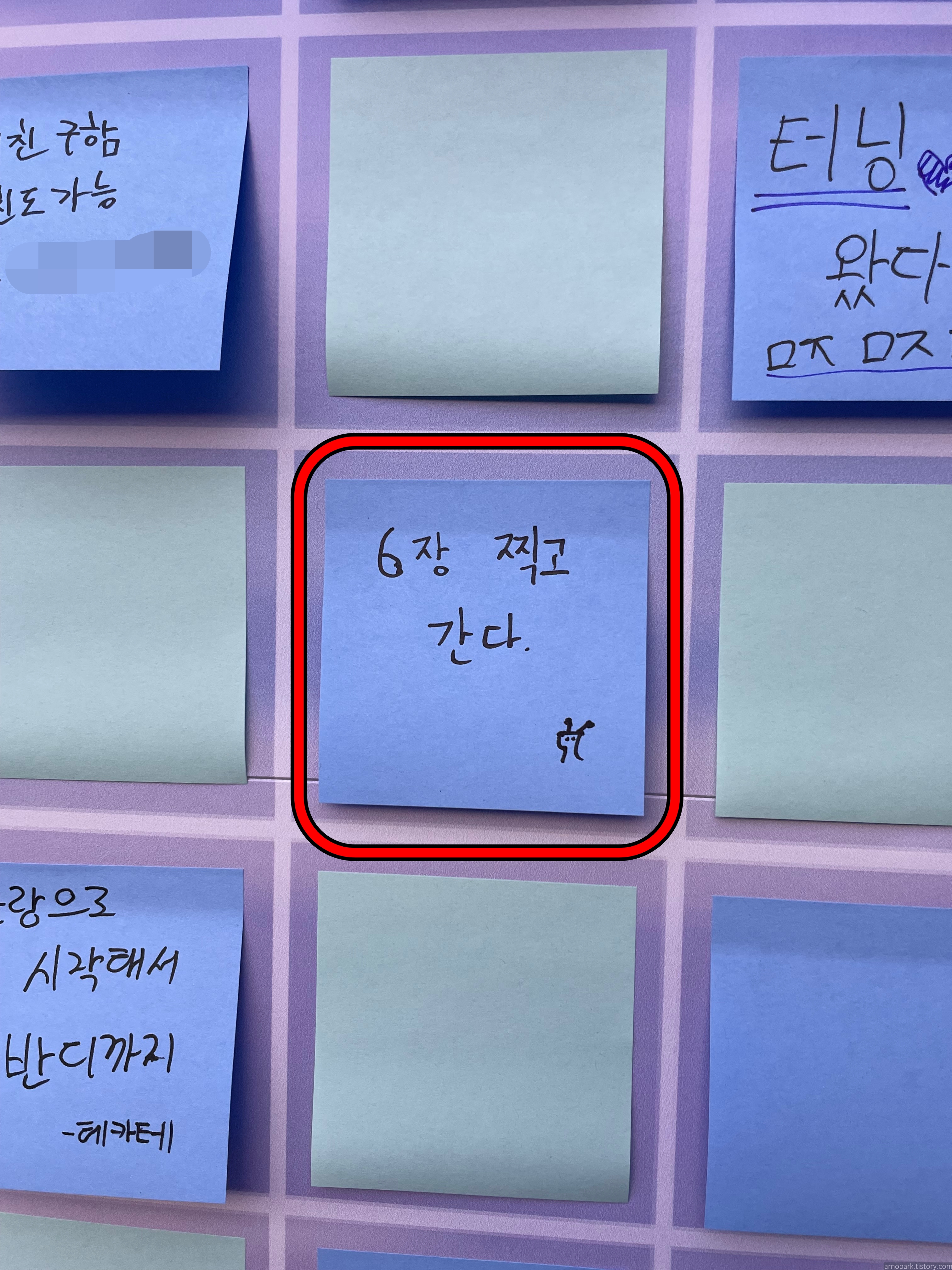 오른쪽 벽에는 개척자들이 반디에게 편지를 쓸 수 있는 포스트잇이 걸려 있습니다.