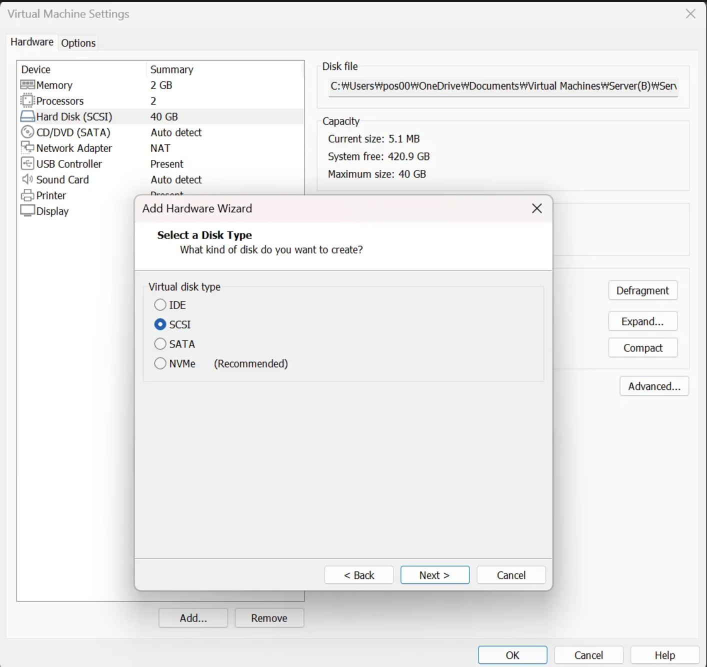 Server와 Server(B) VM은, 추후 실습을 위해 SCSI 포맷으로 지정할 필요가 있습니다.