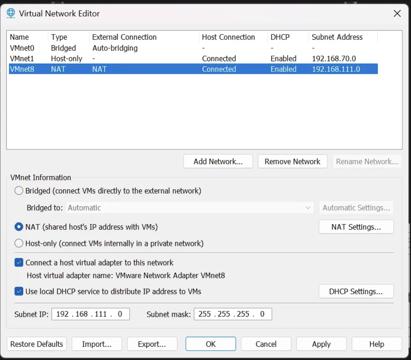 VMnet8의 SubnetIP를 192.168.111.0으로 변경합니다.