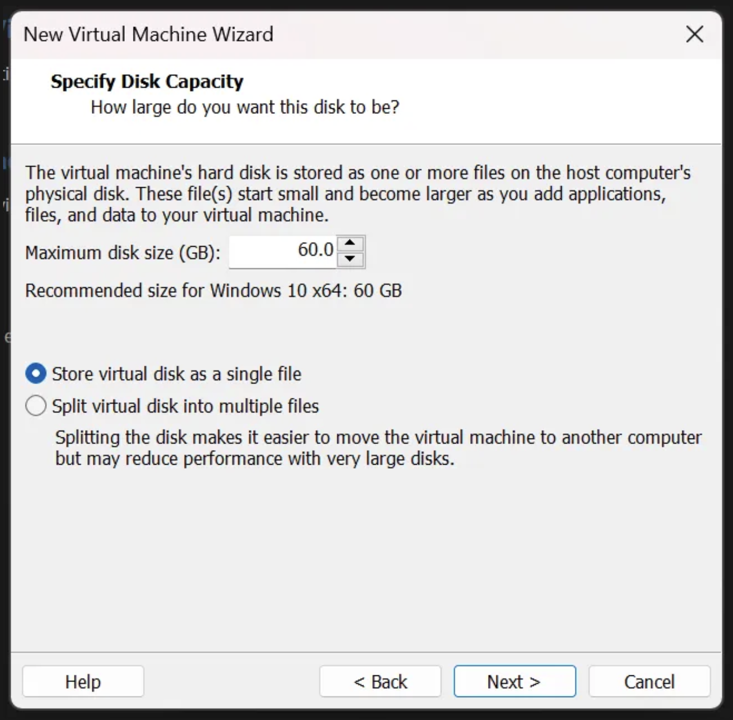 위와 같이 각각 용량을 설정한 뒤, 사진처럼 'Store virtual disk as a single file' 항목을 선택합니다.