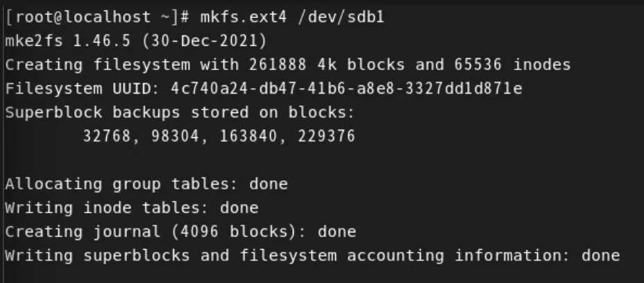 위 명령어로 파티션에 파일 시스템을 생성합니다.