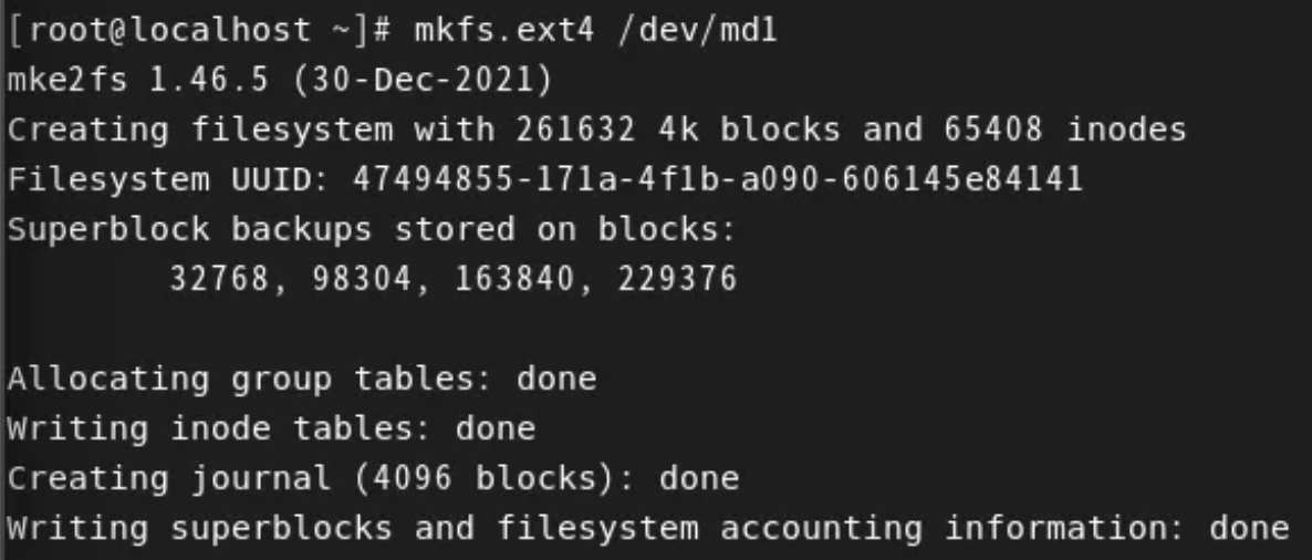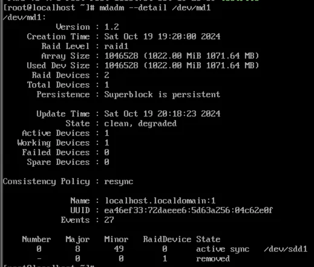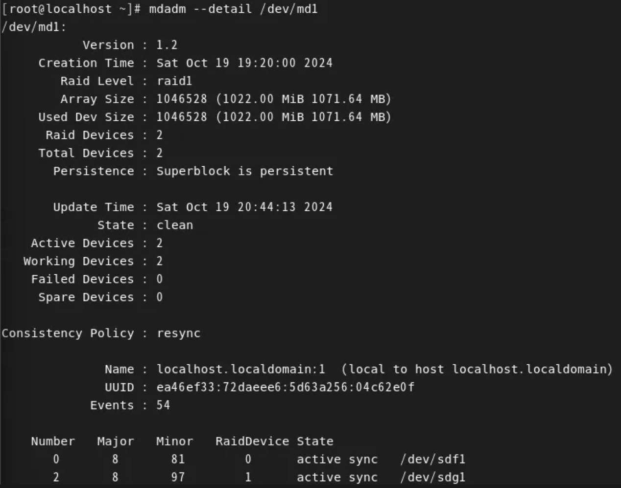 ARRAY /dev/md1 metadata=1.2 name=localhost.localdomain:1 UUID=ea46ef33:72daeee6:5d63a256:04c62e0f