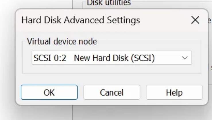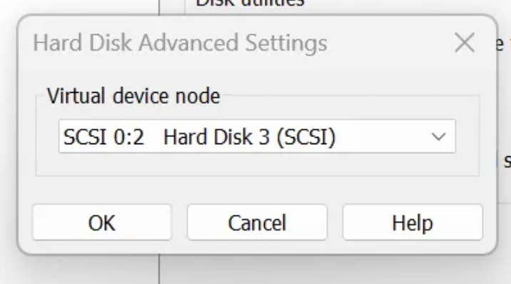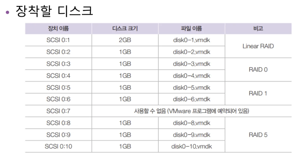 위 문단에서 한 것처럼, 위 표의 형태로 vm 설정에서 하드디스크를 장착합니다.