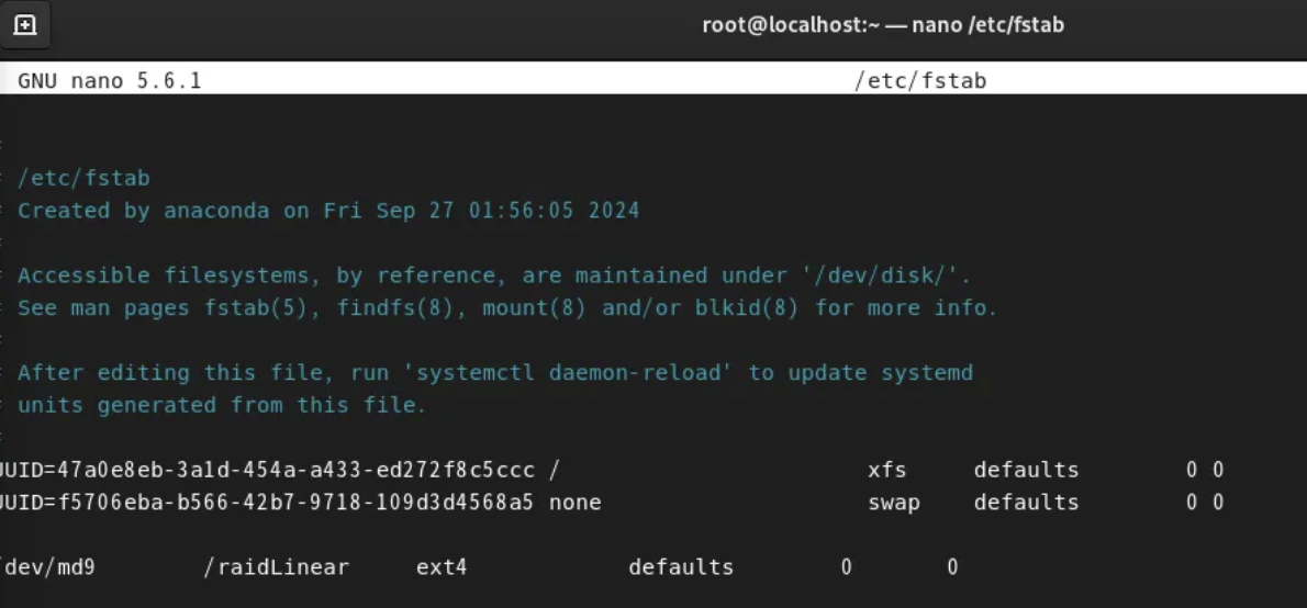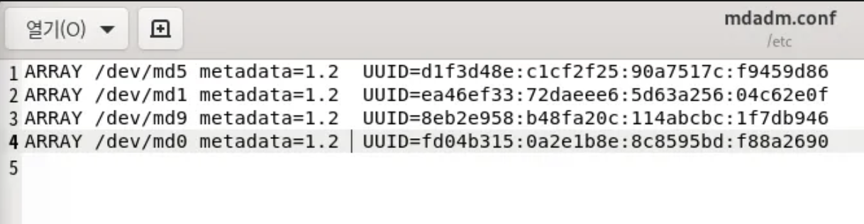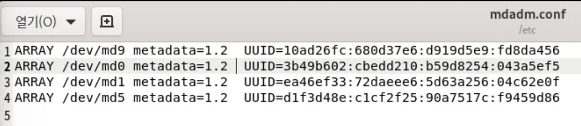 위 명령어를 통해, mdadm 설정파일로 갑니다.
