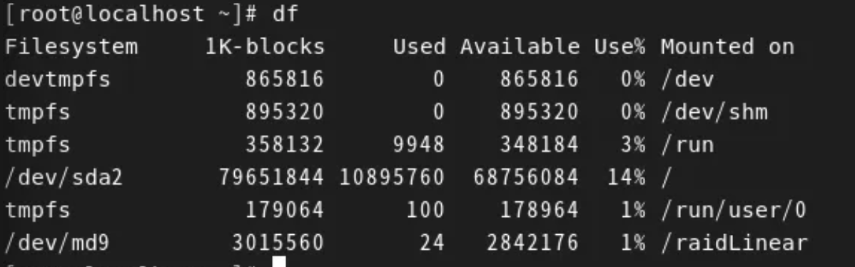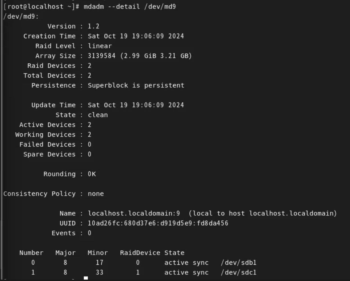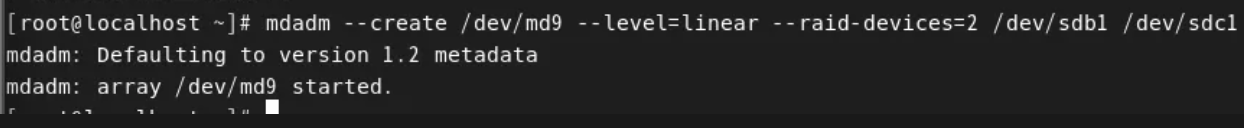 # mdadm --create /dev/md9 --level=linear --raid-devices=2 /dev/sdb1 /dev/sdc1
